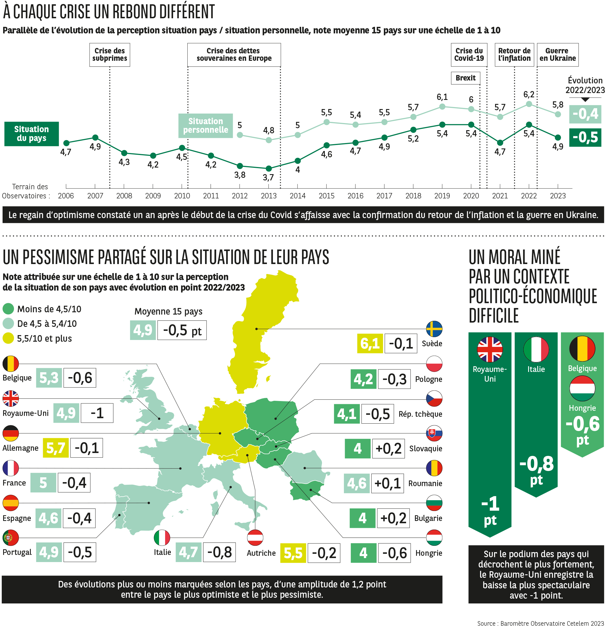 L’an dernier, nous avions quitté des Européens presque euphoriques, qui n’avaient jamais vu la situation de leur pays et leur situation personnelle sous un aussi beau jour. La note donnée à la première repassait au-dessus de la moyenne pour s’établir à 5,4 points. La seconde était record avec un rayonnant 6,2 pour l’ensemble des pays. Comme toujours, le jugement personnel était plus favorable que le jugement global. Qu’en est-il pour 2022 ?