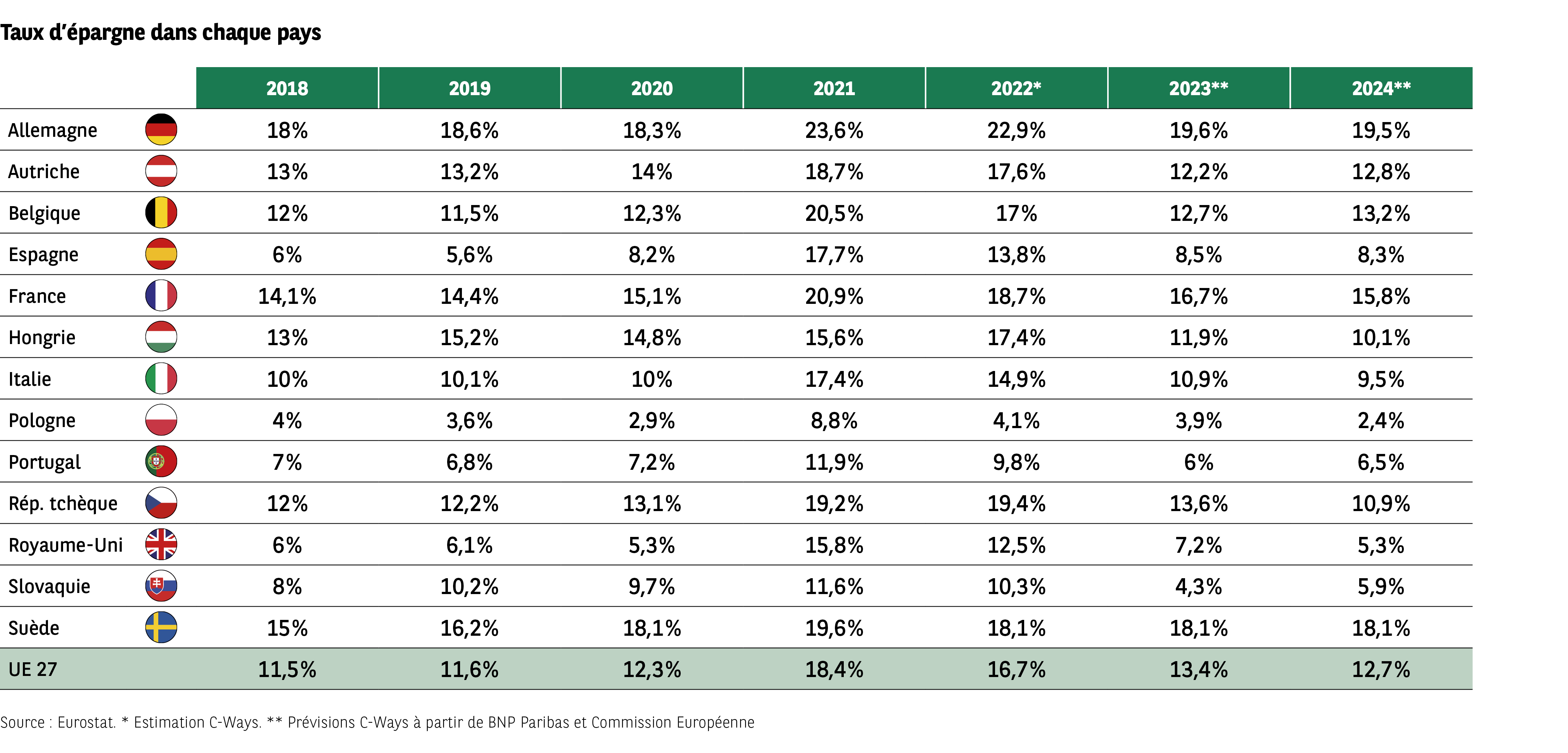 Au sujet de l’épargne, il convient tout d’abord de rappeler sa progression spectaculaire entre 2020 et 2021 dans tous les pays de l’étude, suite à la crise du Covid, avec parfois un doublement, voire un triplement du taux d’épargne comme en Espagne et en Pologne. Autant de « plafonds de verre » difficiles à briser.