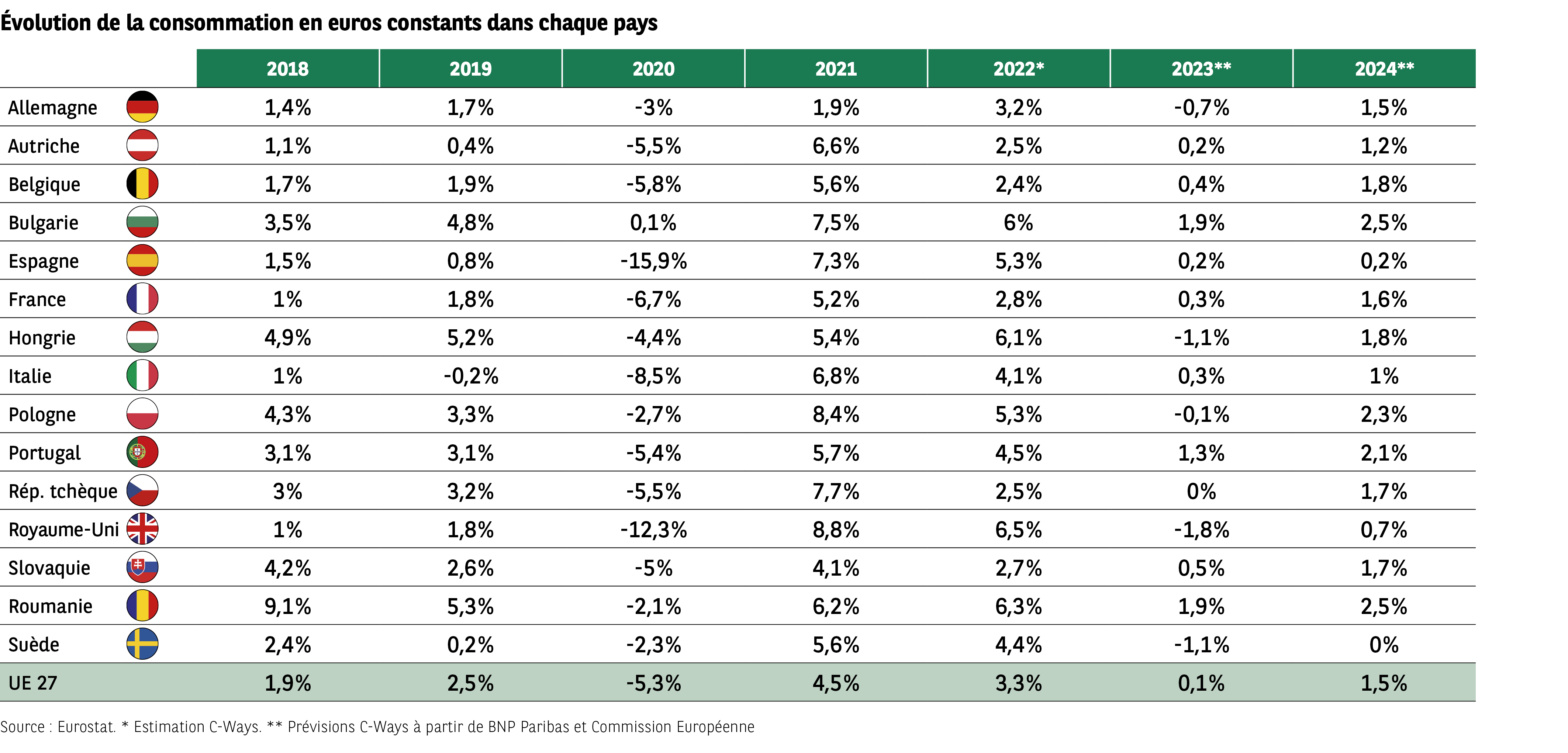 Le niveau réel de consommation, après une année de rebond post Covid en 2022 (+3,3 % au niveau européen), stagnera en 2023 sous cet effet de contrainte.
