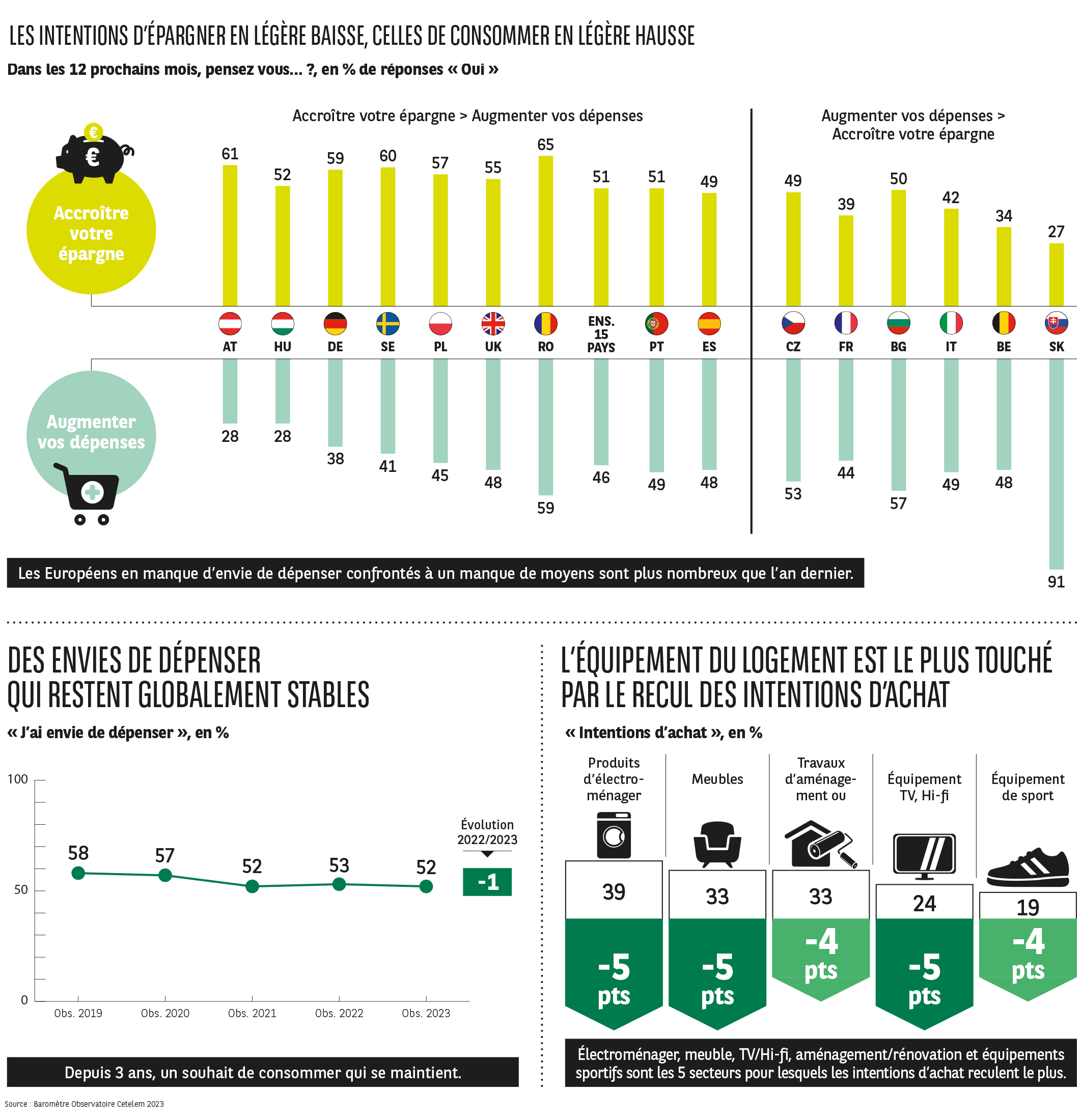 Les envies de dépenser exprimées par les Européens dans ce nouveau Baromètre viennent conforter ce point de vue. En léger recul de 1 point par rapport à l’an dernier, elles concernent 1 Européen sur 2. Fait significatif, 1 sur 4 déclare n’avoir ni l’envie ni les moyens de consommer, un résultat en augmentation de 3 points.