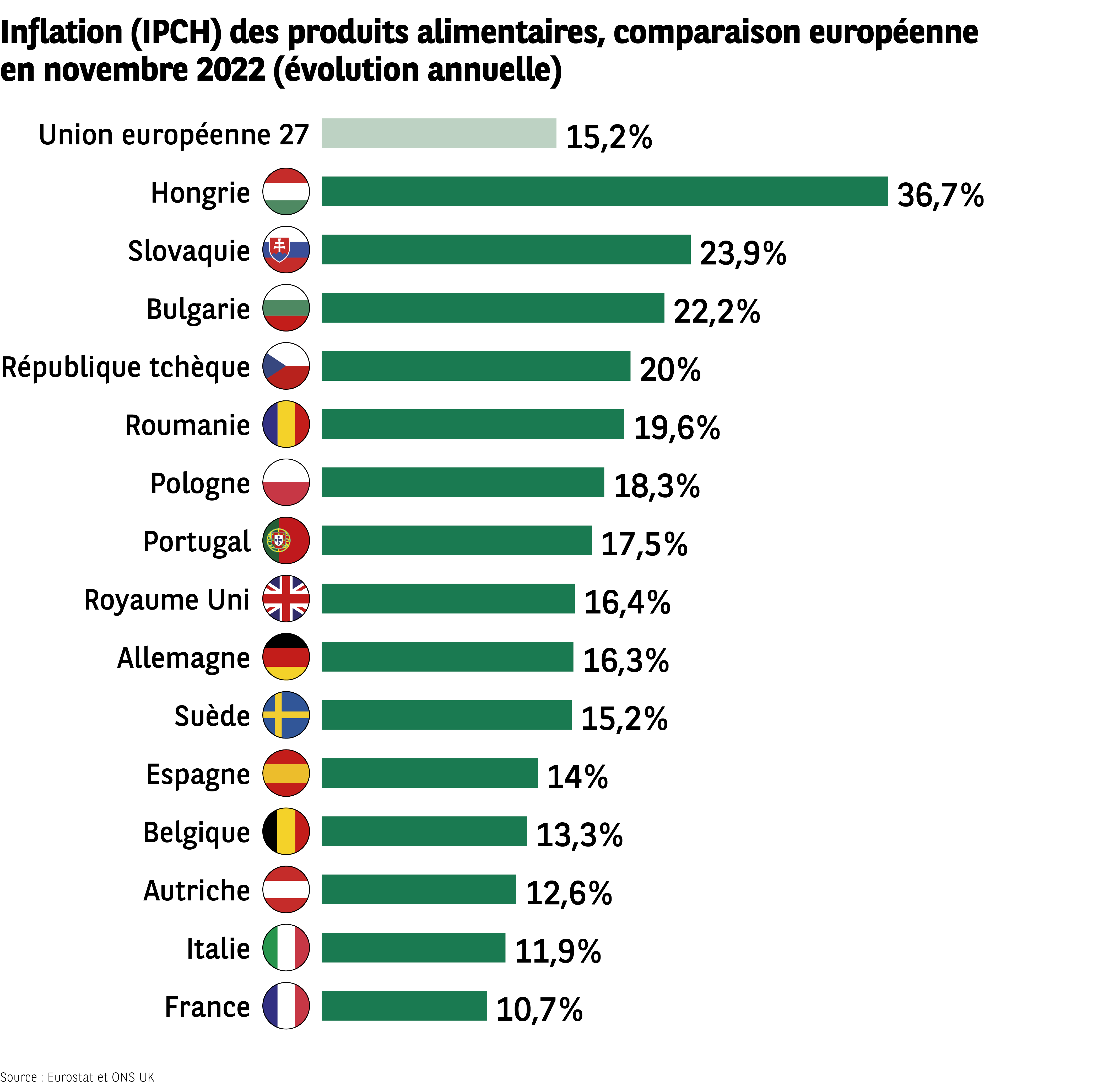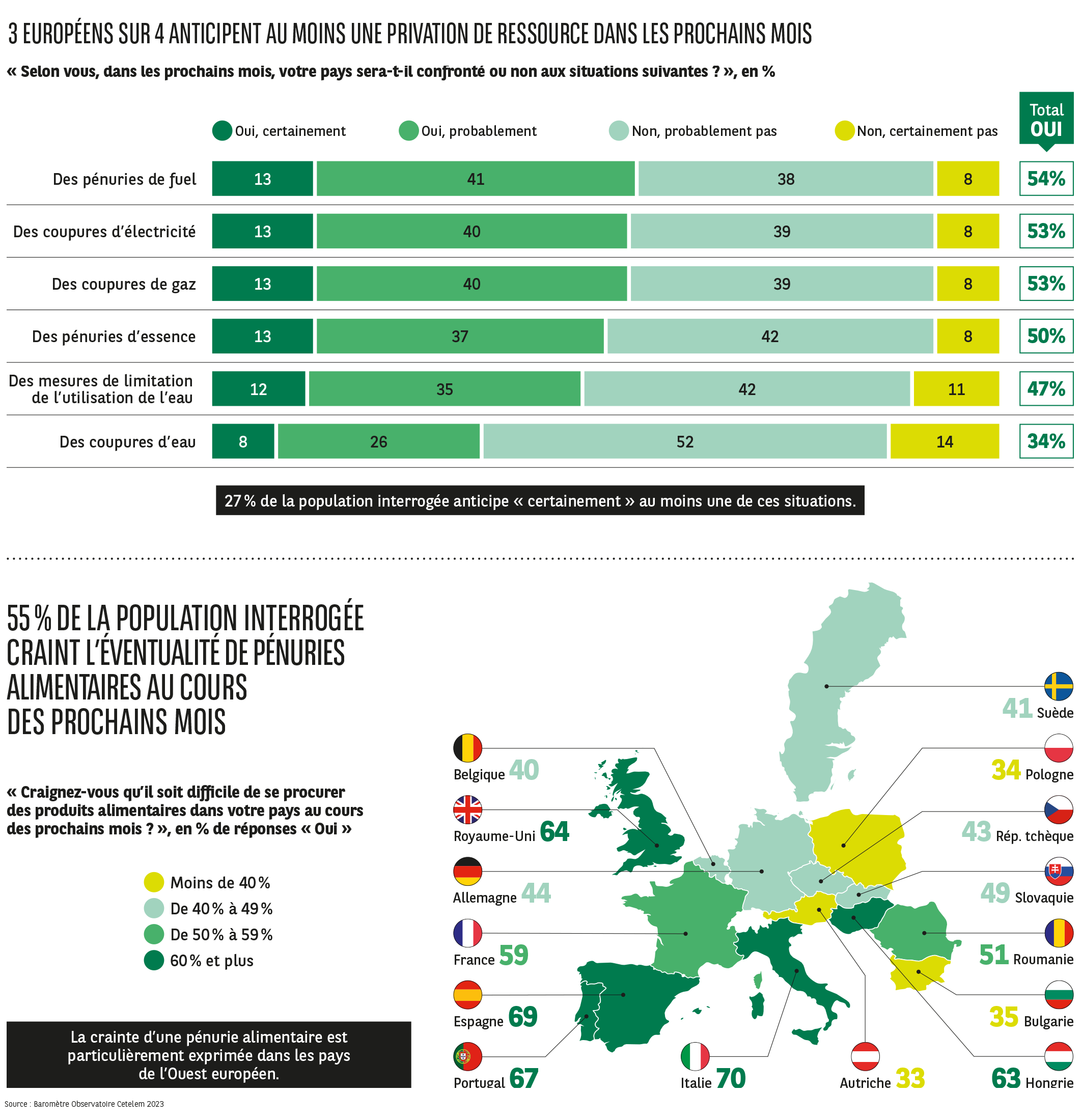 Mais l’énergie n’est pas le seul secteur auquel il convient d’associer le mot pénurie. Le domaine de l’alimentation est tout autant concerné. 55 % des Européens estiment devoir être confrontés à une pénurie de produits alimentaires dans les prochains mois. Les Italiens, les Espagnols, les Portugais et les Britanniques sont sensiblement les plus nombreux à devoir y faire face (70 %, 69 %, 67 % et 64 %).