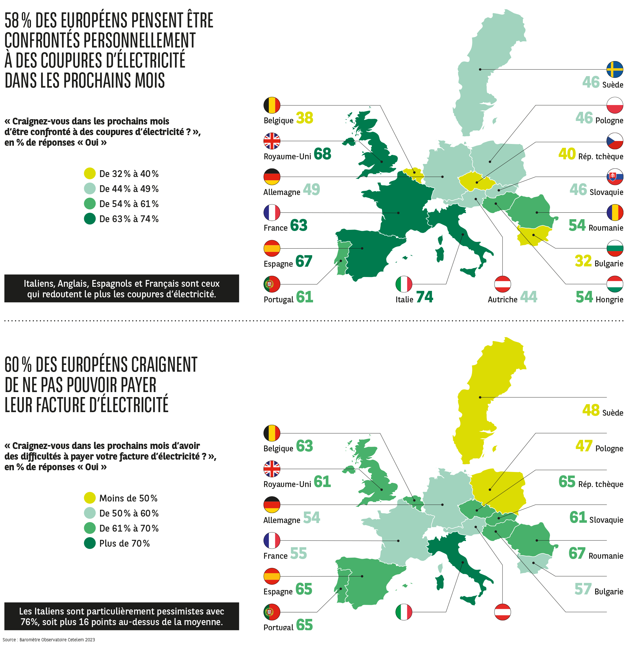 Sur le seul sujet des coupures d’électricité potentielles, 58 % des Européens se montrent inquiets. Et c’est à l’ouest de l’Europe que ces inquiétudes sont les plus fortes, particulièrement en Italie, au Royaume-Uni et en Espagne (71 %, 68 % et 67 %). Devenue importatrice d’électricité, suite à la mise en sommeil de nombreux réacteurs nucléaires, la France se retrouve face à une vulnérabilité qui semblait lui être épargnée, ce qui se traduit par un pourcentage supérieur à la moyenne de personnes craignant des coupures futures.