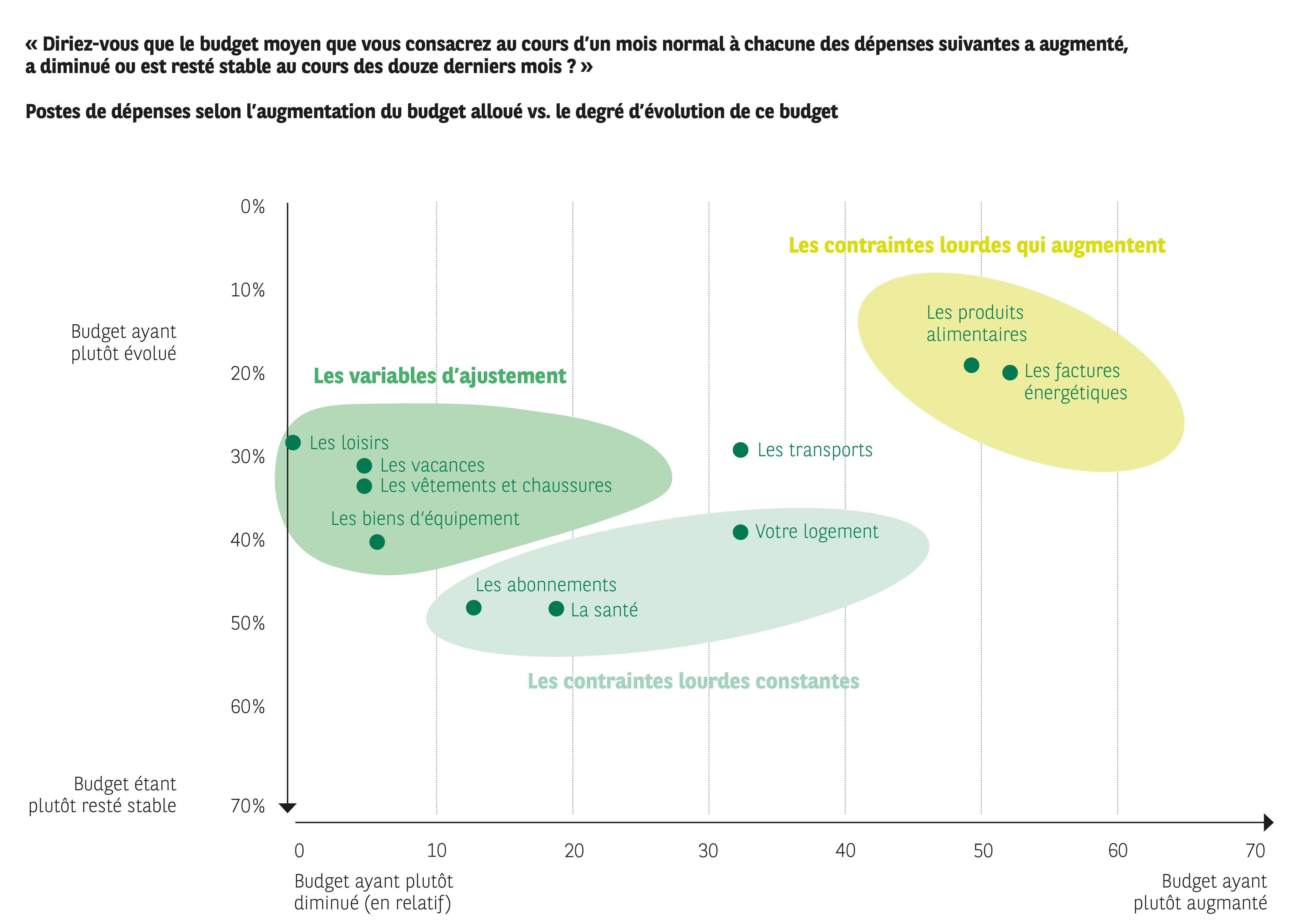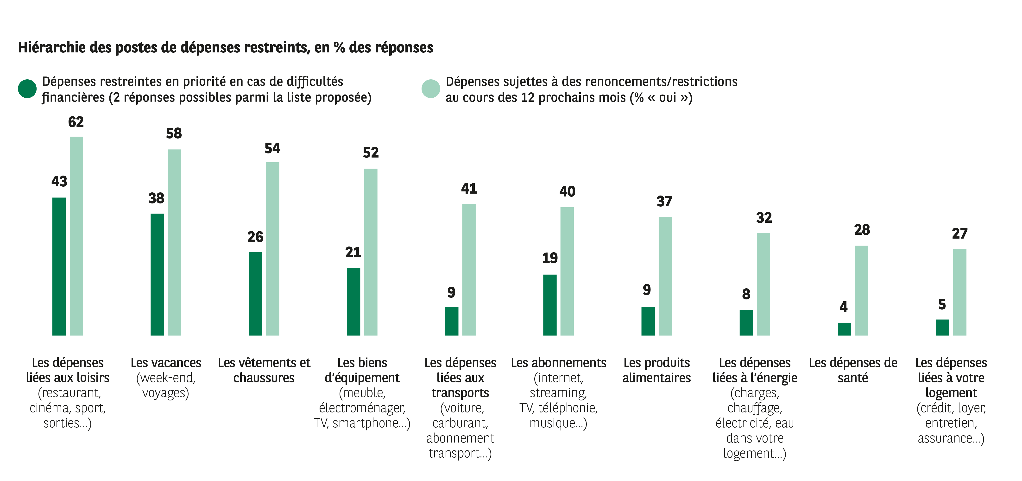 Bien évidemment, l’équipement de la maison et de la personne ont eux aussi été fortement impactés avec des taux de 54 % pour les vêtements et chaussures, 52 % pour les meubles, électroménager, TV et smartphone. Au final, même les postes contraints / obligatoires font l’objet de renoncements. 32 % des ménages ont ainsi diminué leurs dépenses énergétiques et 27 % celles liées à leur logement. Un moindre mal quand on met en regard les hausses de prix constatées ces dernières années.