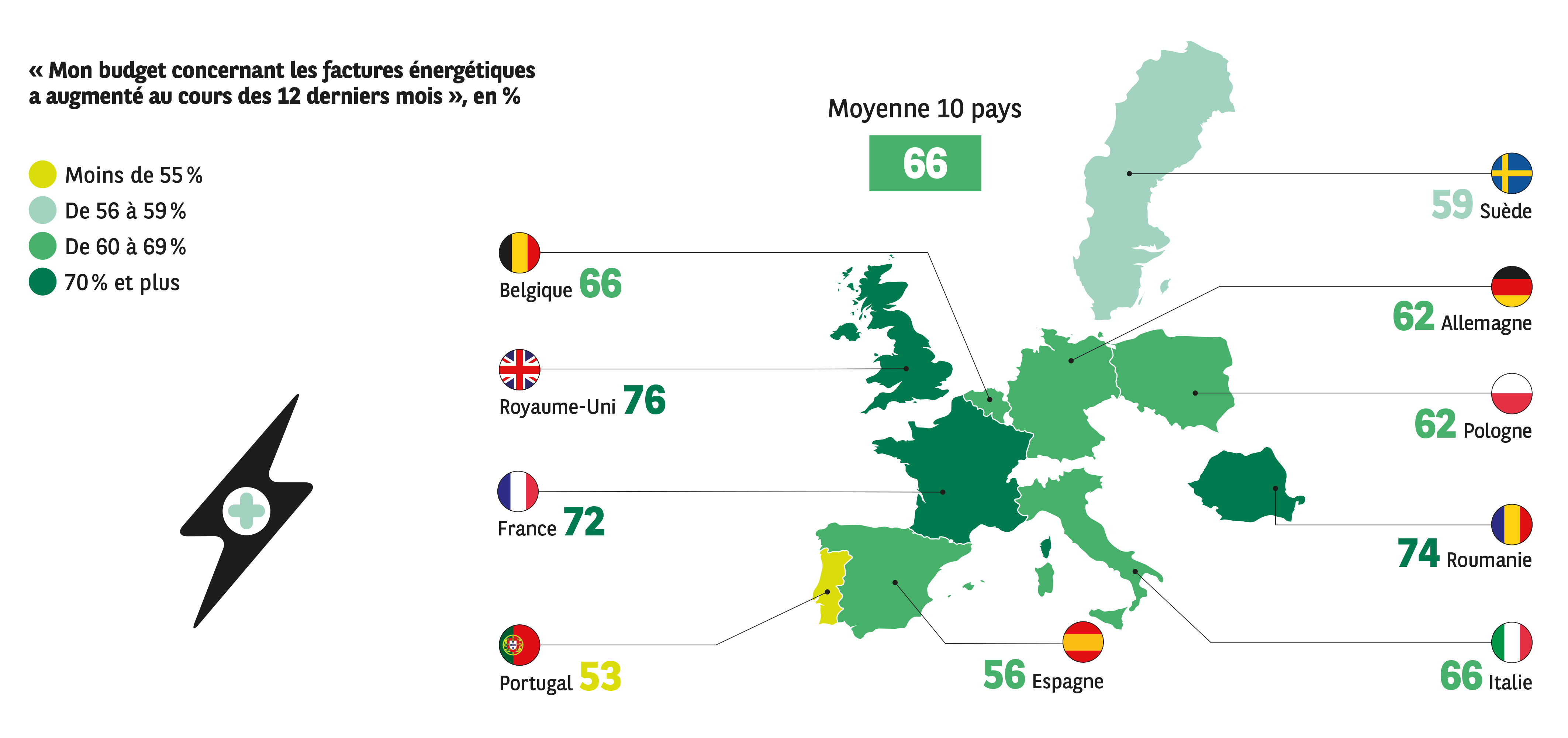 De fait, ces renoncements s’expliquent par l’évolution de la structure mensuelle du budget des ménages et notamment sur le poids des dépenses contraintes « lourdes ». Plus de la moitié des Européens déclarent que leurs factures en matière énergétique (66 %), alimentaire (65 %) et de transport (52 %) ont augmenté ces douze derniers mois. Par exemple, c’est au Royaume-Uni (74 %) et en Roumanie (71 %) que les budgets alloués aux dépenses alimentaires ont progressé le plus (Fig. 15a). Concernant leur facture énergétique, on retrouve de fortes hausses au Royaume-Uni (76 %), en Roumanie (74 %) mais aussi en France (72 %) (Fig. 15b). Une partie des dépenses contraintes restent elles stables. Santé, logement et abonnement sont indispensables mais peu impactés à l’heure actuelle par les hausses.