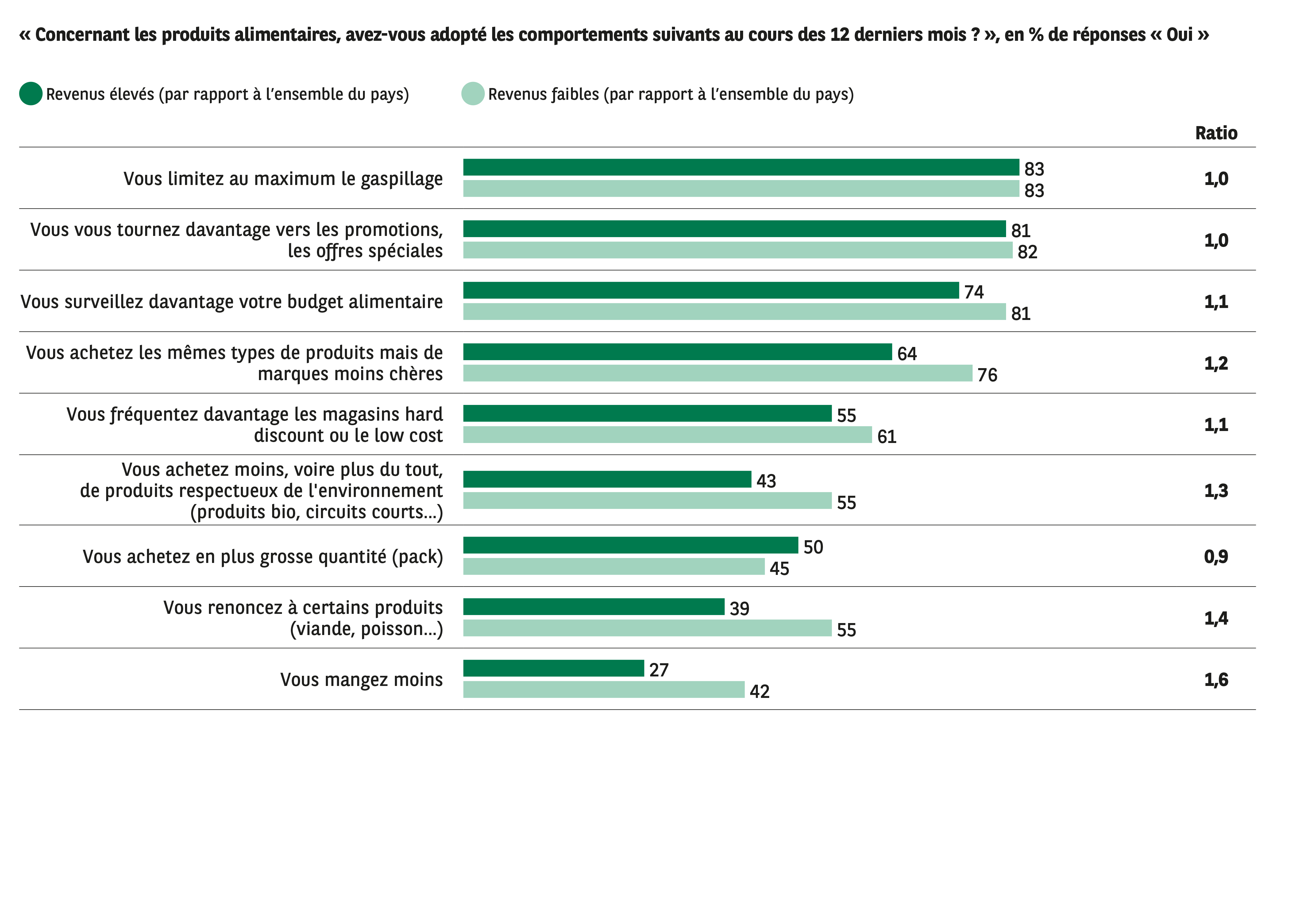 La première est celle du bon sens. Logiquement, 81 % des personnes interrogées déclarent avoir plus recours aux promotions et aux prix bas cette année. Une tendance qui s’incarne très concrètement dans l’évolution des parts de marché des enseignes de distribution alimentaire. Mais on doit aussi intégrer dans cette catégorie la réduction au maximum du gaspillage (83 %), le pilotage à la lettre du budget alloué (77 %) et bien sûr le changement d’enseignes pour privilégier le low cost et le hard discount (58 %).
