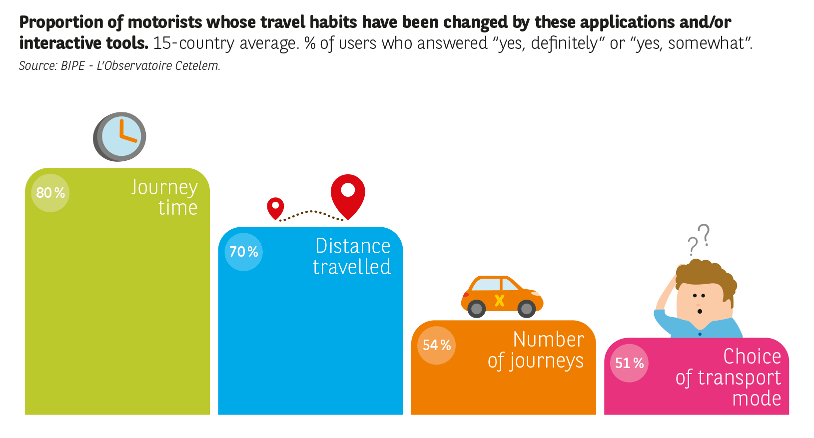The navigation applications available in vehicles and/or via smartphones and the internet in general, have a significant impact on personal mobility (Fig. 17). Indeed motorists declare that they have altered their habits in terms of journey times (80 %) and the distances travelled (70 %), but also, in a significant proportion of cases, in terms of the number of journeys made (54 %) and the mode of transport chosen (51 %).