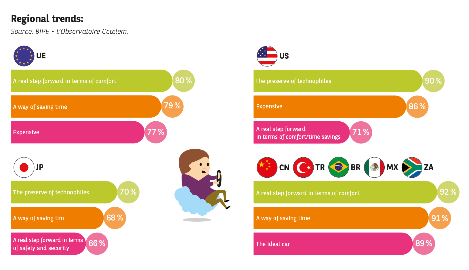 In Japan, while the overall level of enthusiasm is a little less pronounced than in emerging countries, the top three opinions regarding connected cars are all positive: comfort, time savings and safety are the attributes most commonly highlighted.