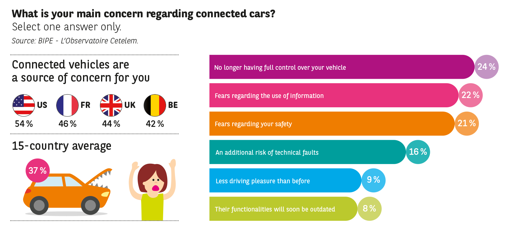 While connected cars represent a major step forward in the eyes of most motorists, in some rare cases they also raise fears (Fig. 20): Overall, 37 % admit that connect cars are a source of concern for them, but the figure is 54 % in the United States and 46 % in France. The fear of no longer controlling the vehicle and concern over the way in which the data sent might be used are the two main sources of worry. In the United States, where the most advanced autonomous vehicle trials are taking place and where a few accidents involving these vehicles have occurred, the fear of no longer being in total control of the vehicle is more apparent (33 % vs. 24 % on average). The Germans, on the other hand, seem more apprehensive about the use made of the information communicated by the car and the loss of control over their private data (32 % vs. 22 % on average). The car-loving Italians appear more fearful than most about surrendering the pleasure of driving (17 % vs. 9 % on average).