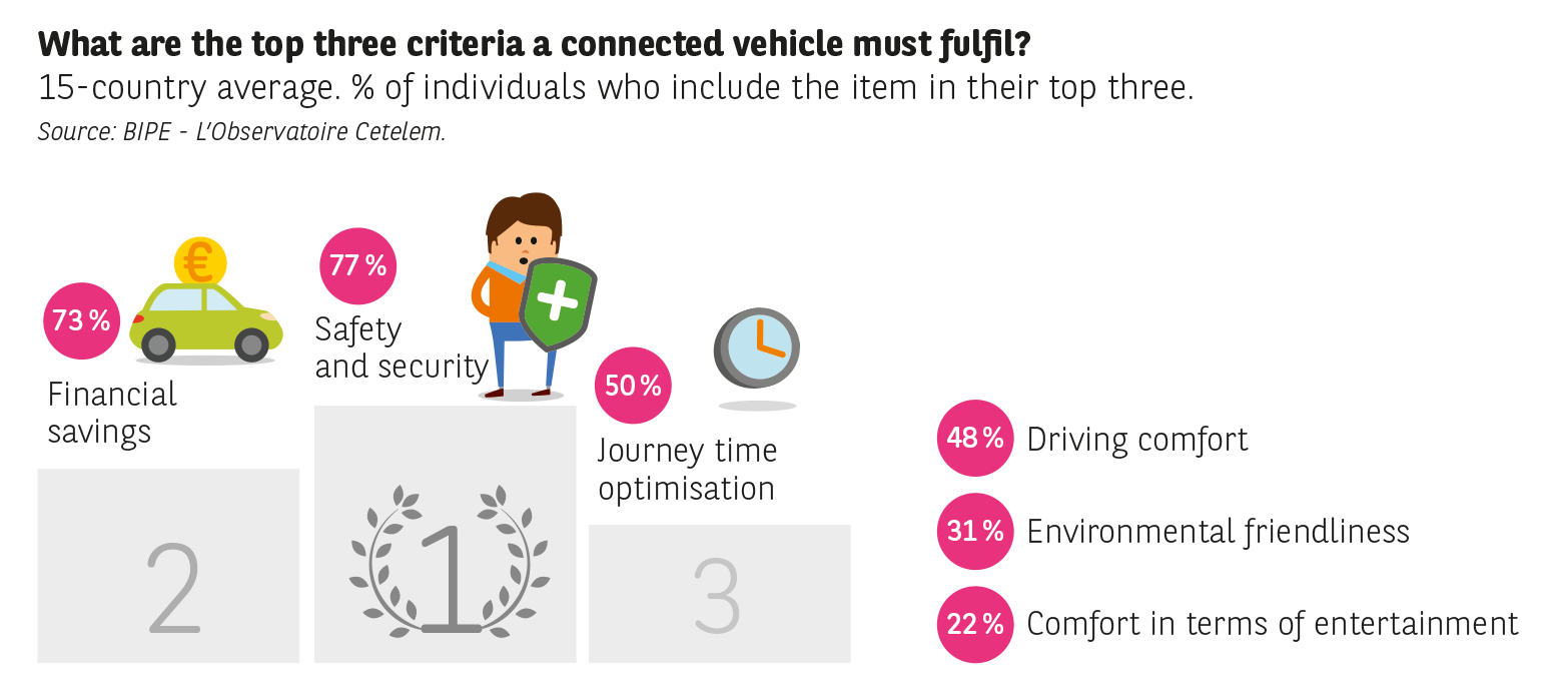Indeed, they are synonymous with genuine progress in terms of driving comfort for an average of 83 % of those surveyed, with time savings for 81 % and with improved safety for 77 %. But motorists are not so naive as to imagine that these technological advances will not come at a cost: 78 % believe that connected vehicles will inevitability be expensive.