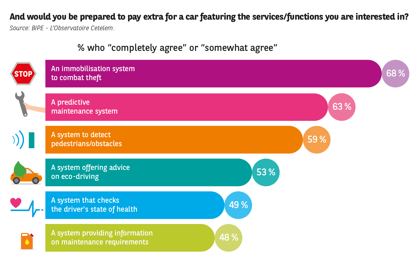 Although systems that check the driver’s state of health are not among the most popular functionalities in this survey (they receive a favourable response in 70 % of cases on average in the 15 countries, placing them 10th), those interested in these types of feature seem particularly keen on the benefits they bring, as almost half are prepared to invest in them (49 %, 5th place).