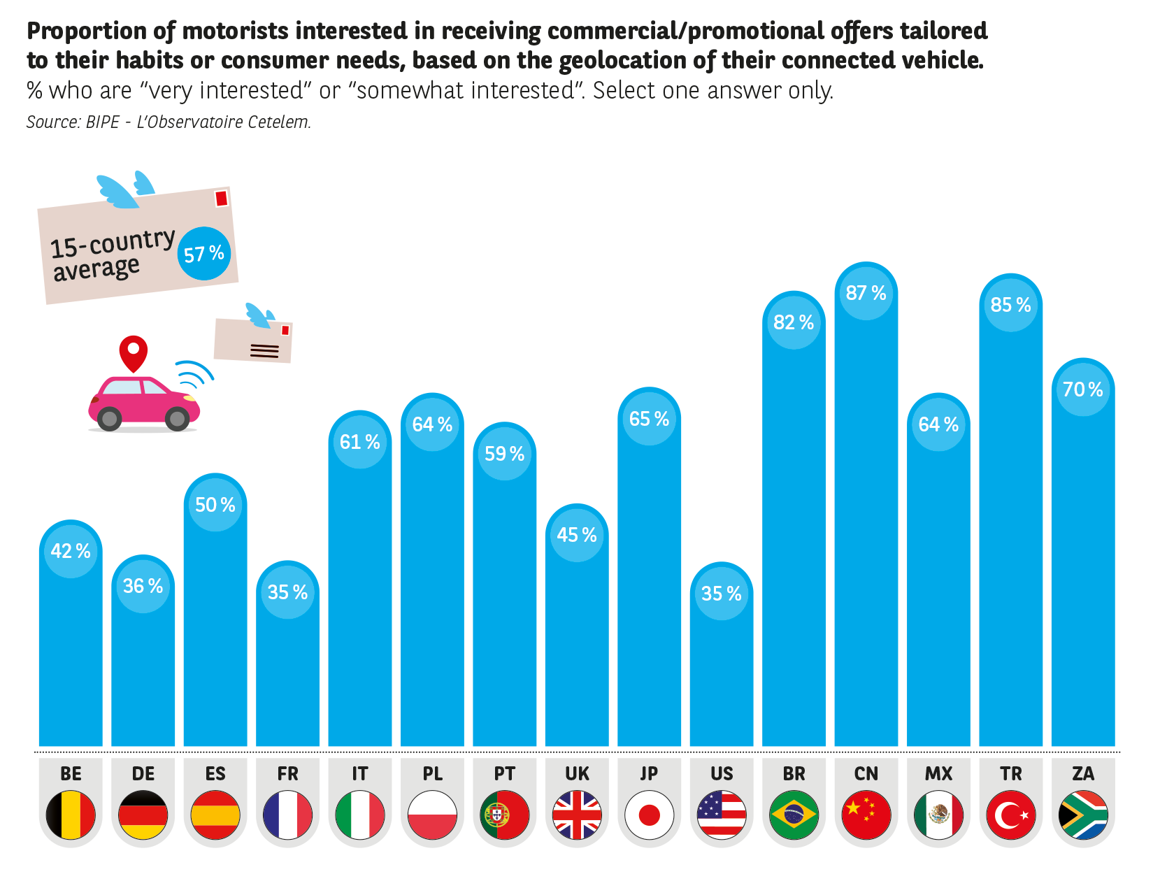 The geolocation of connected cars will allow motorists to receive commercial or promotional offers tailored to their habits or consumer needs. This is a prospect that an average of 57 % of motorists are excited by.