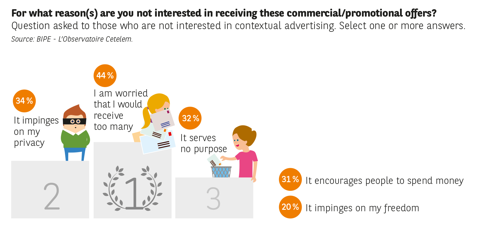 The main fear among the 43 % of motorists who say they are not interested is that cars will be turned into a new advertising medium (Fig. 25). Indeed, motorists are concerned that this personalised advertising would become too invasive (44 %), and 34 % believe that it would impinge on their privacy. The Spanish (37 %) and French (40 %), but also the Mexicans (47 %) and Turks (40 %), go as far as stating that these types of offer primarily encourage spending. This degree of reticence is now prompting EU Member States to revise European regulations, so as to reinforce the control consumers have over their data and its protection.