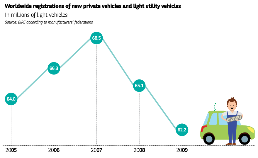 In the United States, sales plummeted to their lowest point in 30 years. Having reached a figure of 16 million light vehicles per year during the previous decade, they collapsed to just 10 million in 2009. It was not long before this climate of gloom hit Europe. The global market fell by 10% in two years.