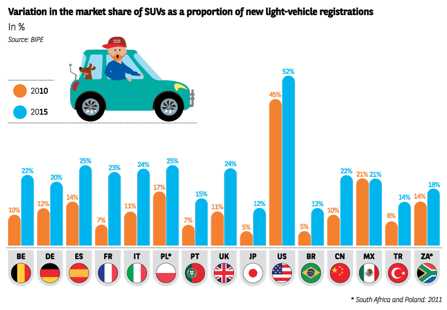 The SUV segment has been the quickest to get back to speed. Already accounting for more than 50% of light-vehicle registrations in the United States (pick-ups included), the market share of SUVs in Europe leapt from 8% in 2010 to 20% in 2015. Their popularity is particularly striking in Italy (22%), Spain (21%) and the United Kingdom (20%). Even in Japan, where sales growth remains tentative, these models have become favourites among motorists, particularly the younger generations. The same can be said of the emerging countries, with SUVs now accounting for almost a quarter of sales in China.