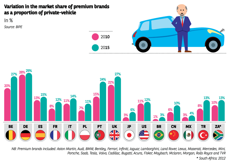 In China, their market share almost doubled, rising from 6% in 2010 to 10% in 2015. Hitherto focused on traditional large saloon cars, premium brands are now investing in more compact segments, which are particularly prized by young women from the wealthier classes. The appearance on the market of a new generation of second-time buyers (the first cohort to replace their vehicles since the market took off 10 years ago), also explains why premium brands are doing such good business. Indeed, replacing one’s vehicle often means making a move up-market. What’s more, the purchasing restrictions imposed in large cities naturally favour potential buyers with the highest incomes, who are obviously more likely to opt for premium brands.
