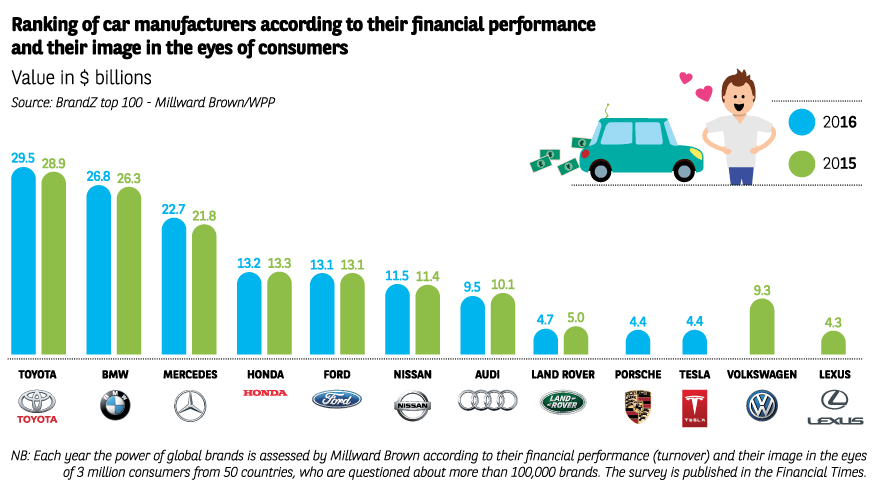 One new entrant in particular has received a great deal of attention. Tesla, the first US car maker to be floated on the stock exchange since the 1950s, is a product of Silicon Valley and has made a speciality of high-end electric vehicles. Its ambition is to attain the same stock market value as Apple by 2025. The rapid increase in the firm’s worldwide popularity between 2012 and 2015 is undeniable. What’s more, it is said to have And in 2016, the brand featured among the top 10 most valuable car brands of the Millward Brown BrandZ ranking, a sure-fire sign that «the future is now».