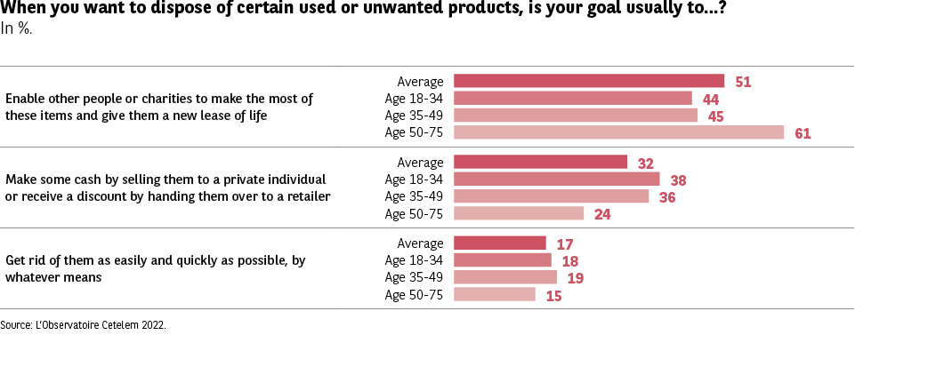 The under-50s tend to make a very different choice and are much less divided on this point. Only 45% of 35-49 year olds and 44% of under-35s donate unwanted items, while 36% of the former and 38% of the latter succumb to the desire to make some cash.