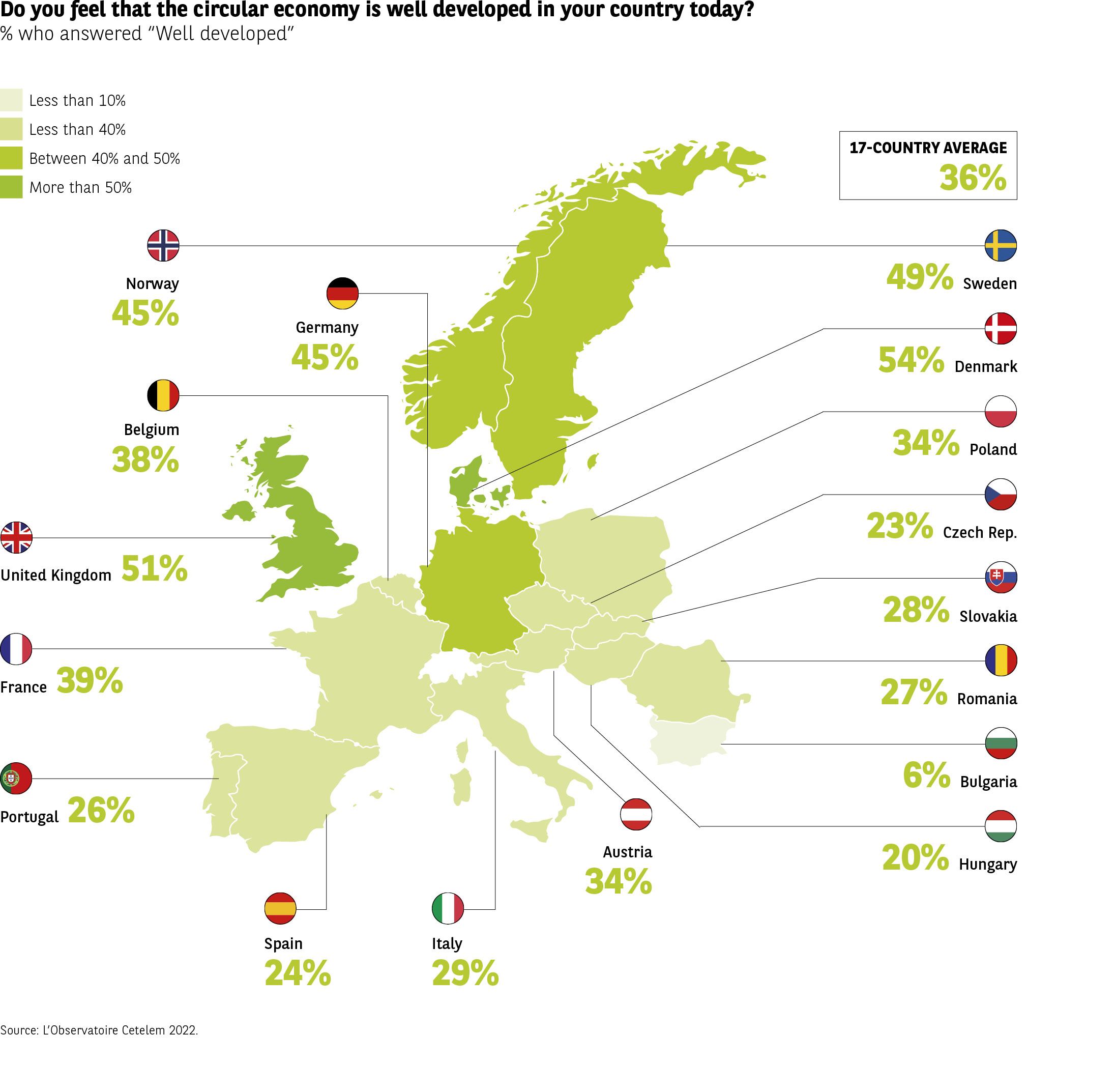 The infographic presents the percentages of people who claim that the circular economy is developed in their country.