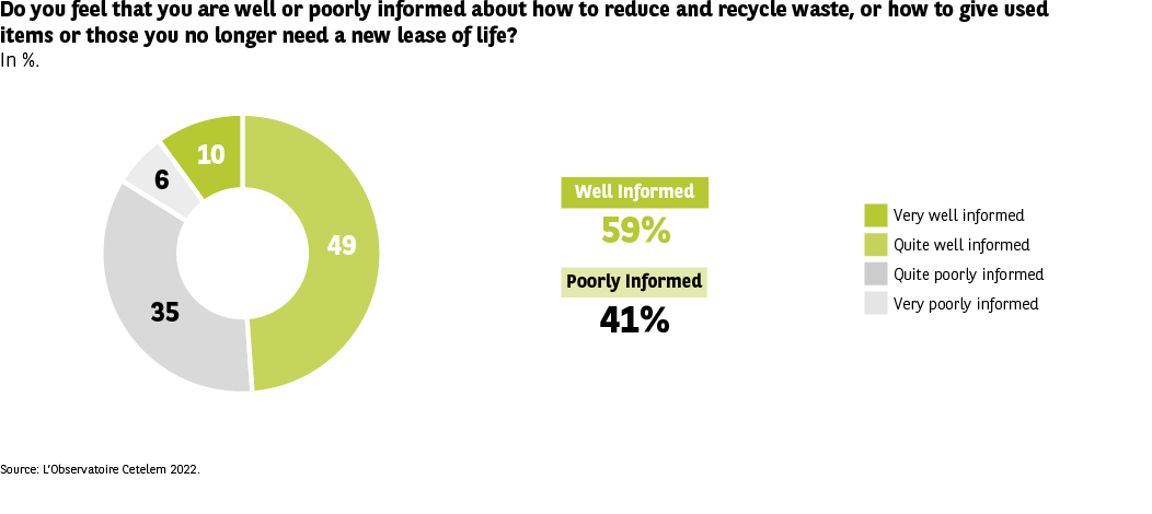 The question asked is: “Do you feel well or poorly informed about how to reduce waste, recycle, or give a second life to objects?” Unit: %. Circular diagram with informative colors (4 levels of information). Source: Cetelem Observatory 2022.