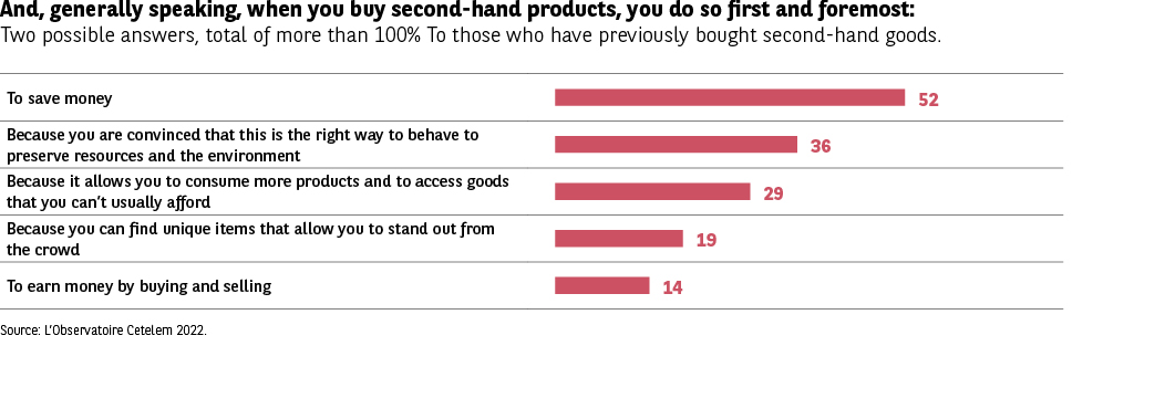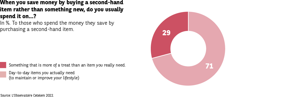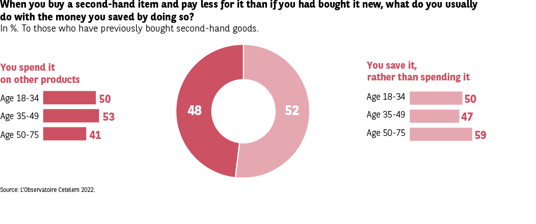 The infograph answers the question: “When you buy a second-hand product, cheaper than a new one, what do you generally do with the saved amount?” The analysis focuses on people who have already bought second-hand products. Unit: %. Source: Observatoire Cetelem 2022.