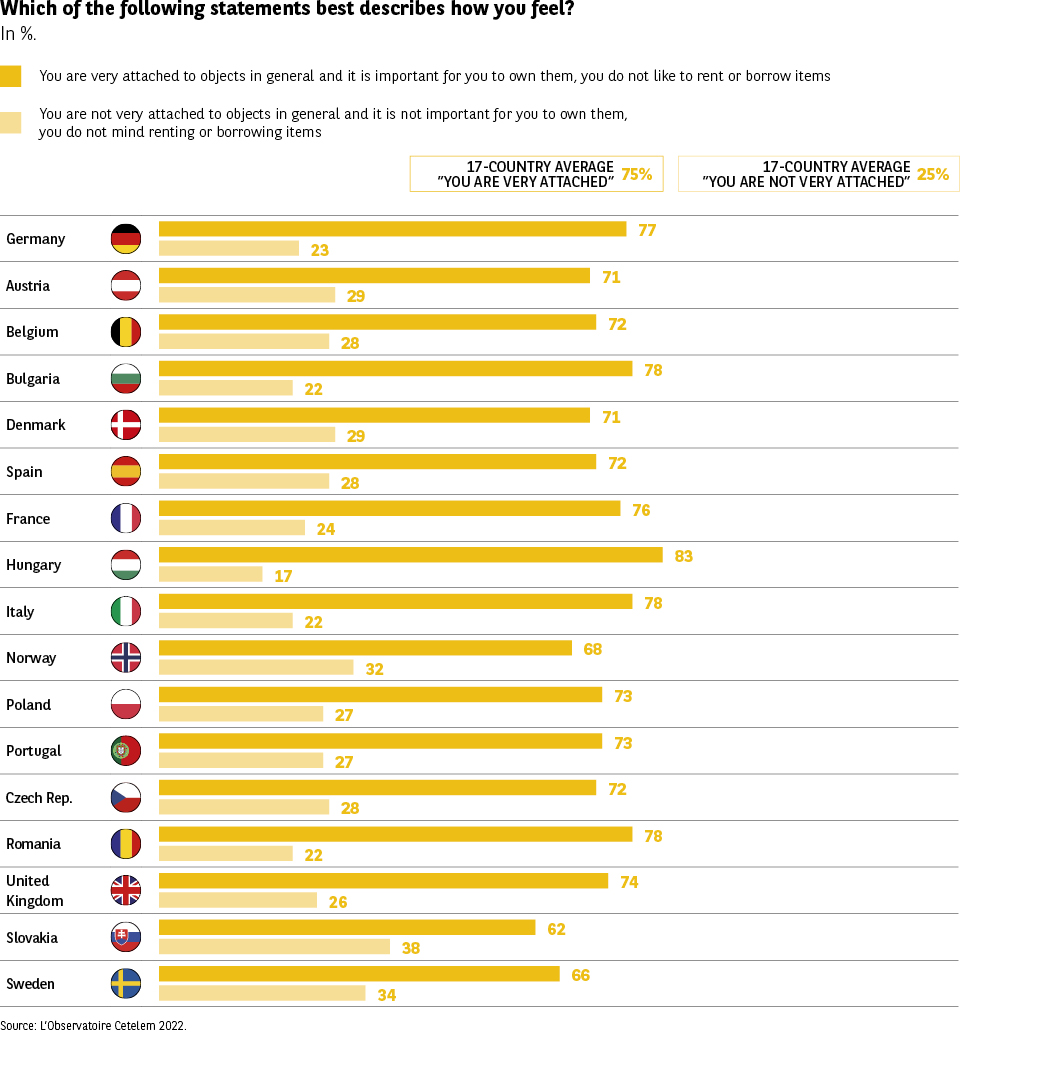 Analysing these attributes prompts us to revisit the very foundations of retail. Although the circular economy places an emphasis on second-hand goods and recycling, ownership still has a bright future ahead of it. 3 in 4 Europeans declare that they are very attached to the idea of owning possessions (Fig. 21). Once again, generational differences can be observed, with older respondents placing greater value on ownership than their younger counterparts. The Swedes, the Norwegians and especially the Slovaks are the least enthusiastic about ownership, while the Hungarians, Bulgarians, Italians and Romanians sit at the opposite end of the scale.