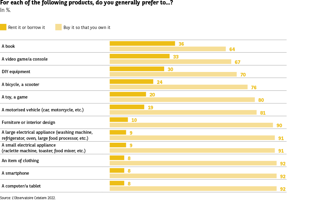 Another mainstay of retail, buying new, is alive and well. Regardless of the product category, Europeans would rather purchase than rent the items in question (Fig. 22). Nonetheless, 36% of respondents prefer to rent or borrow a book and 33% a video game or console. The existence of libraries offering books and other media largely explains this result. 30% also like to rent DIY equipment, which is an understandable choice, depending on the type of tool, given that people tend not to renovate their home every day. And one only has to take a walk in a city to see why 24% like to rent bicycles and scooters. In contrast, while the refurbishing of mobile phones is a rapidly developing segment, 92% of Europeans still prefer to buy them new.