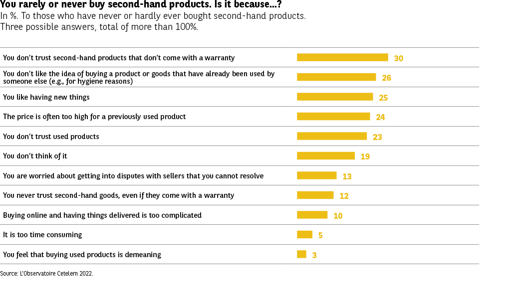 The guarantees offered by retailers and brands play an essential role in the trust-based relationships they seek to establish with consumers, a trust that goes some way to ensuring that they remain loyal and therefore make repeat purchases. The views put forward by Europeans on this issue will convince companies to continue down this path. For 30% of respondents, and an even larger proportion of seniors, the lack of a warranty is the primary reason not to buy second-hand products (Fig. 23). These reservations are most likely to be expressed by the Hungarians and the Spanish, while the Romanians and Danes are the least likely to do so. Next on the list comes the thought of buying a product that has already been used by someone else (26%), followed by the desire to buy something brand new (25%). These results appear to confirm that Europeans remain very keen on all that is new, in the widest possible sense.