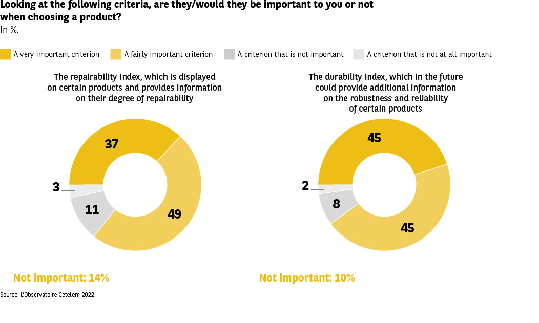 In a way that is not unrelated to the need for guarantees, brands and retailers can also leverage the high expectations of customers in order to secure their loyalty. Indeed, 86% believe that a repairability index is an important or very important factor when choosing a product (Fig. 24). More strikingly still, 90% express this view when asked about a durability index, which would provide information about a product’s robustness and reliability. Regarding the first of these two indices, the Italians and Portuguese are almost unanimously in favour (94%) while the Danes and Swedes are less keen (76% and 77%). As for the second, once more the Italians and Portuguese are the most ardent in their desire for sustainable and responsible trade (95% and 97%), while one must again head to Northern Europe to find lower expectations in this area. This is perhaps because adherence to certain ethical standards is more of a given in the North.