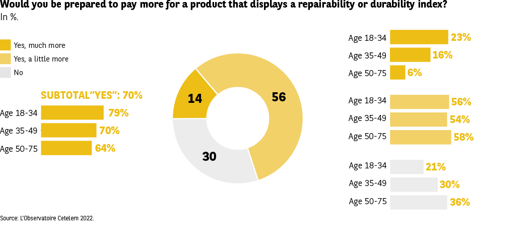 This desire for reassurance when it comes to repairability and durability is not without consequence for the price of products. Quite the contrary in fact. Europeans are aware that this commitment by brands and retailers to be more responsible may come at a cost, but they are willing to accept it. 7 out of 10 Europeans say they are prepared to pay more for products that are labelled in this way (Fig. 25). The Romanians, Bulgarians and Hungarians are clearly in favour (84%, 83% and 80%), while the French and Belgians are slightly more reluctant to loosen their purse strings (61% and 63%). From a generational perspective, 8 out of 10 under-35s say they are willing to pay a higher price for products they will be able to rely on for longer.