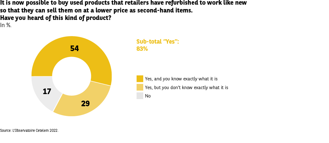 The importance consumers place on durability and repairability mirrors the success of refurbished products, phones in particular. Far from being a fad, as we saw previously with the circular economy, this has become a well established part of the consumer landscape (Fig. 26). Just over 8 out of 10 Europeans have heard of it, and 1 in 2 understand exactly what it is. And this awareness knows no borders. The Latin countries, led by Italy (9 out of 10), display the greatest awareness of the practice. The Czechs are the least likely to have heard of it, although the figure is still 7 out of 10. It is therefore in the best interests of brands and retailers to make the most of this awareness by embracing refurbishing and exploiting its many benefits.