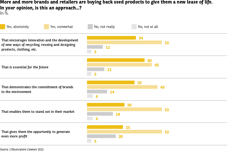 It appears that consumers have a very positive opinion of brands and retailers moving into the second-hand market by retrieving products they have sold previously to give them a new lease of life. At the top of the list, 86% believe that companies treat it as an opportunity to demonstrate their sense of innovation. Every country surveyed is in agreement on this point, with the Italians and Portuguese once again expressing this view the loudest.