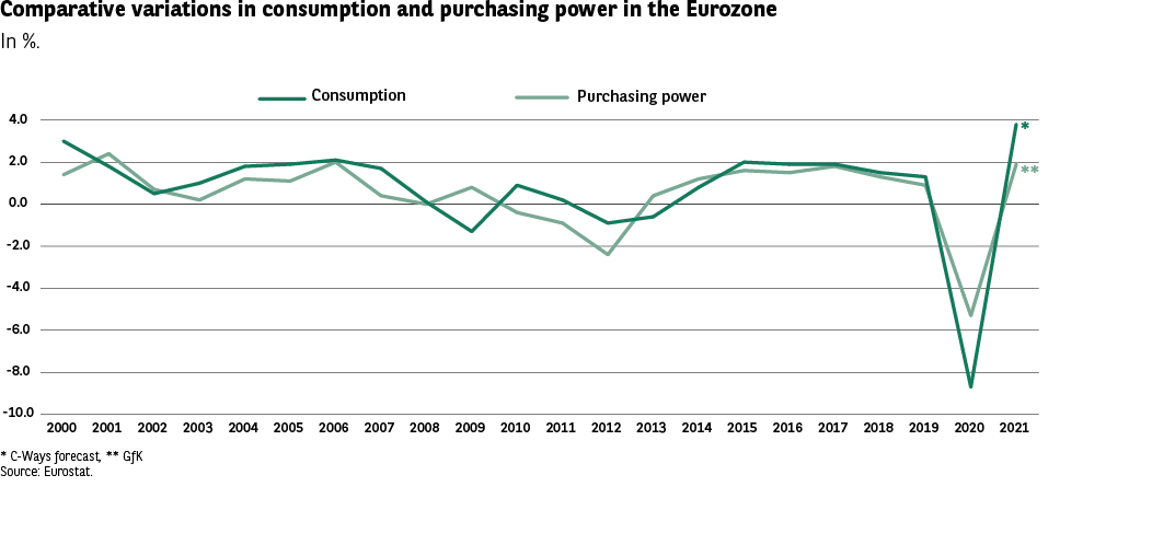 2021: • Very strong rebound, above +4% for consumption, and around +2.5% to +3% for purchasing power.