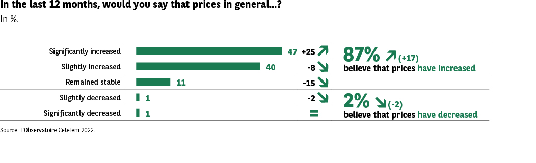 The perception of a generalized price increase is overwhelming: nearly nine out of ten Europeans consider that prices have increased. The proportion of people perceiving an increase is increasing strongly (+17 points), while the perception of a decrease is becoming marginal (2%).