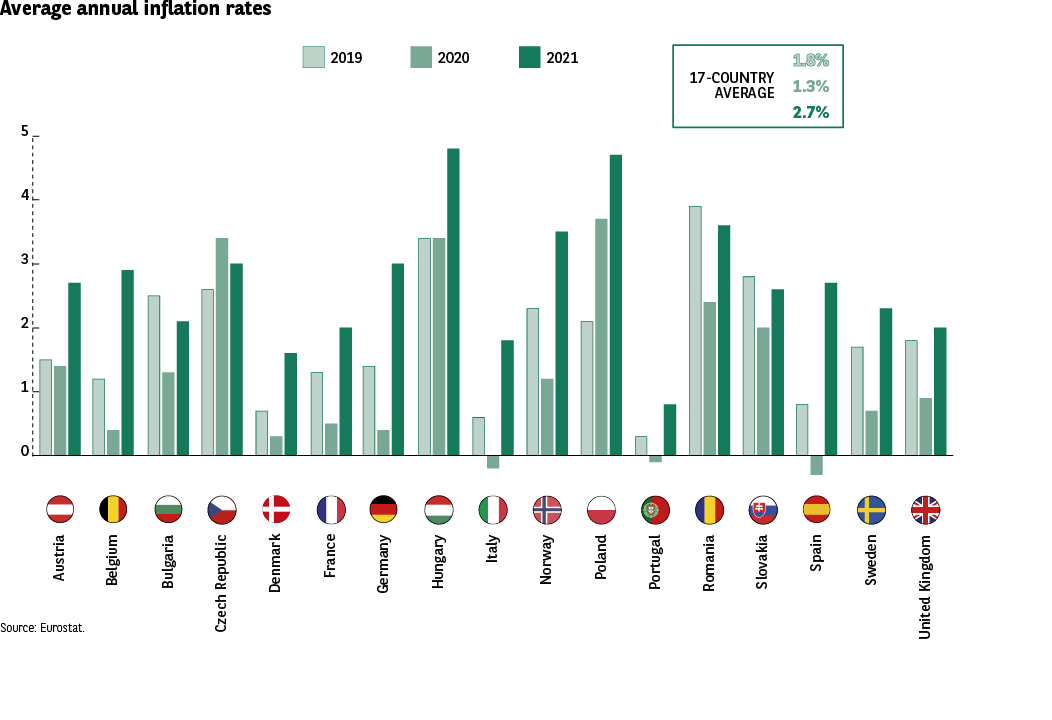 This infographic compares the average annual inflation rates for 17 European countries over three years: • 2019 • 2020 • 2021