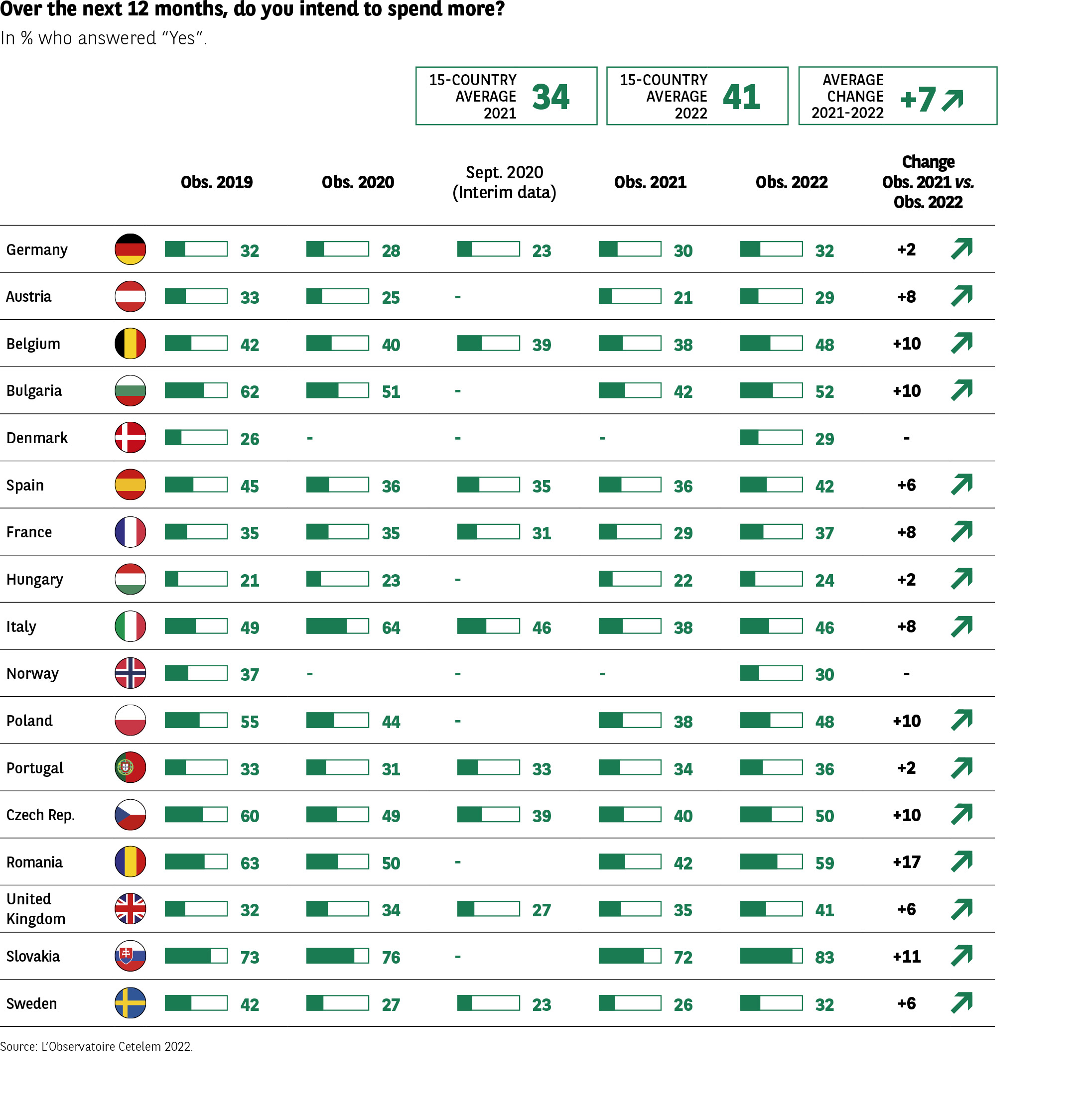 Thus, spending intentions are back up to pre-pandemic levels, with an average of 41% across the countries covered by the survey. In every country, these intentions have either remained stable or increased. In some nations, the rise has been particularly sharp, not least in Eastern Europe, with Romania emerging as the starkest example of the phenomenon (+17 pts). Slovakia also stands apart, with 83% of respondents saying they intend to increase their spending.