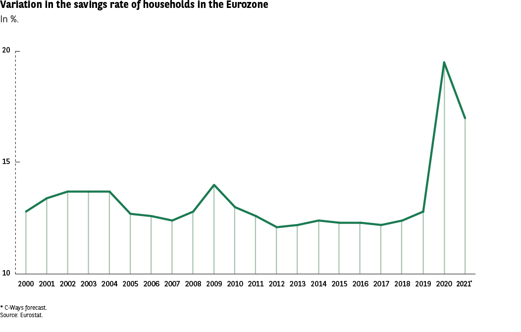 Over 20 years, the savings rate of households in the euro zone is relatively stable, oscillating around 12-14%. In 2020, an unprecedented jump is observed, reaching nearly 20%, linked to exceptional conditions (not explicitly stated in the infographic).