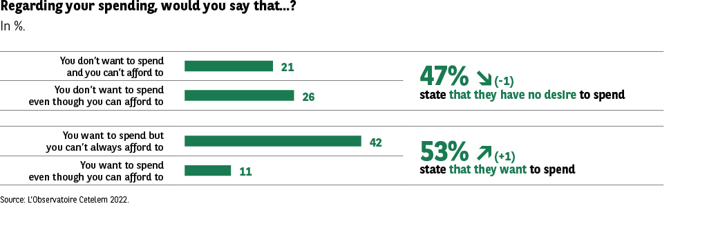 The health crisis had led to a marked decline in people’s desire to spend and a greater willingness to save, with the notion of precautionary saving being more relevant that ever before. The 2022 Observatoire Cetelem Barometer sees this trend reversed somewhat. However, the reversal is not complete, because while the desire to spend more is up 7 points (Fig. 4 Barometer), the desire to save more is as strong as in the previous edition (Fig. 6 Barometer).