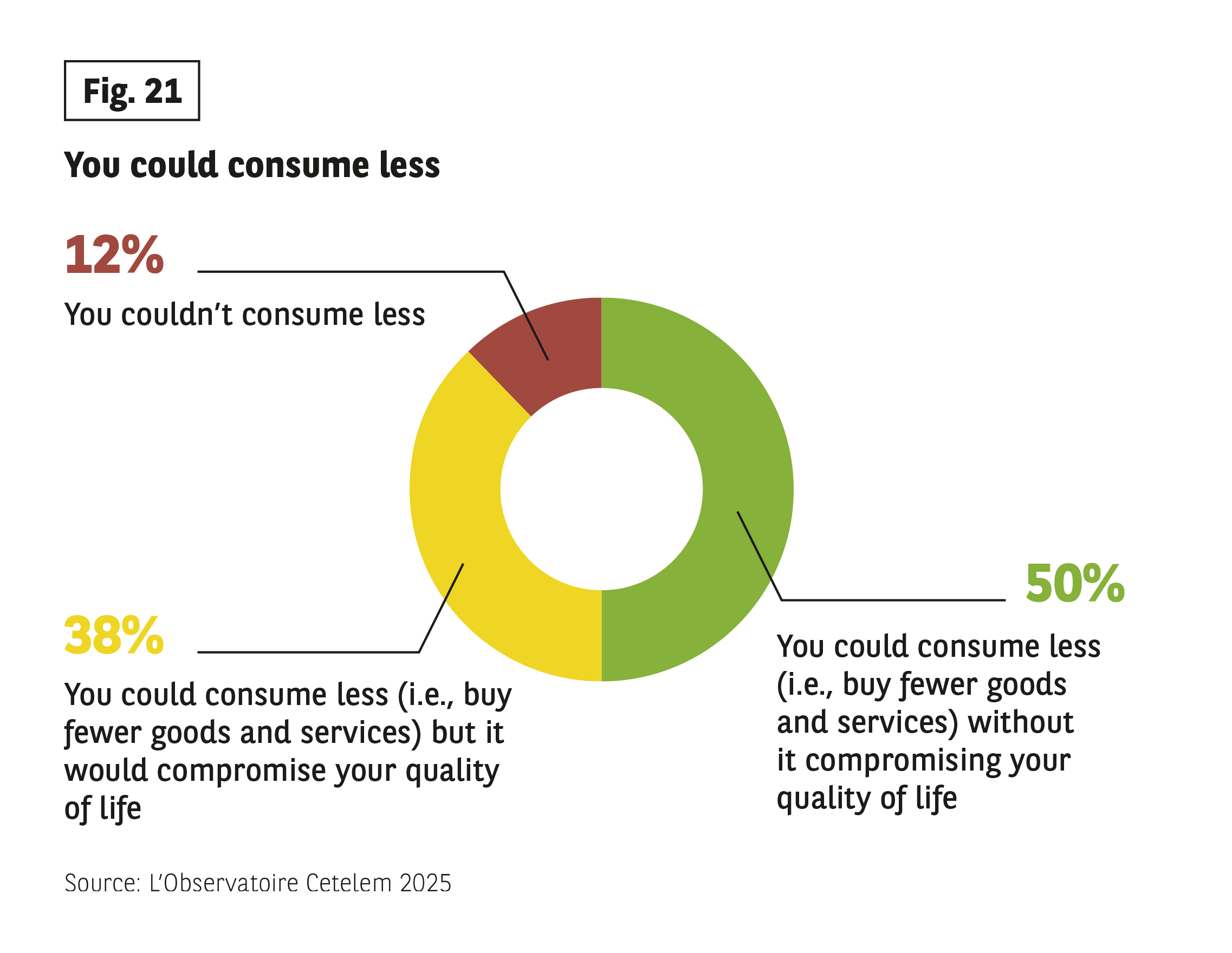 Despite Europeans believing that consumption is on the up and that it is synonymous with enjoyment, frugality is also firmly on their agenda. The vast majority – almost 9 out of 10 – would consider consuming less, with half of those questioned remaining focused on preserving their quality of life nonetheless (Fig. 21).