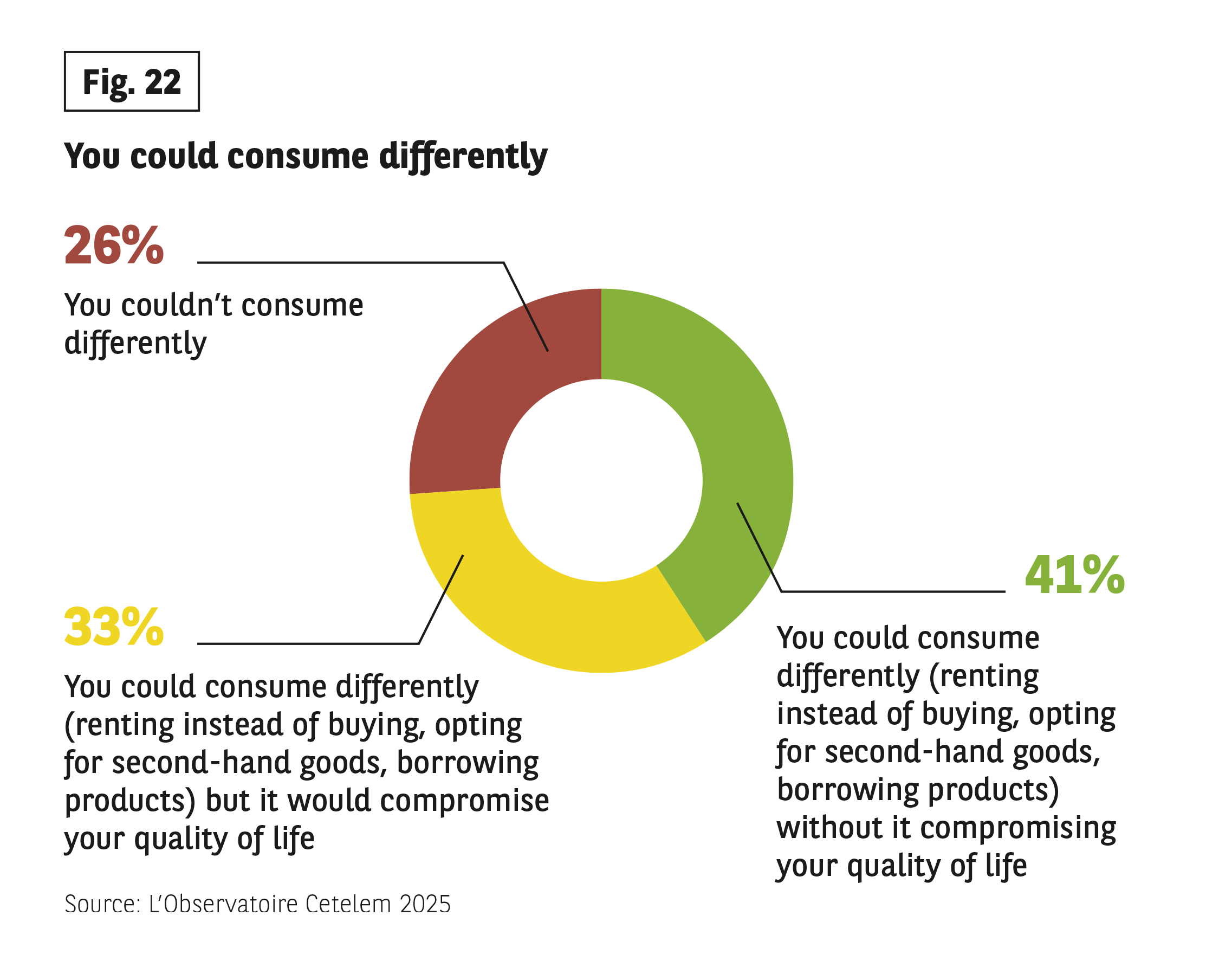 While consuming less is central to the whole debate, consuming differently is just as important. Europeans appear quite receptive to the idea. Three-quarters of them agree with the premise, although a thin majority are keen for it not to negatively affect their quality of life (Fig. 22).