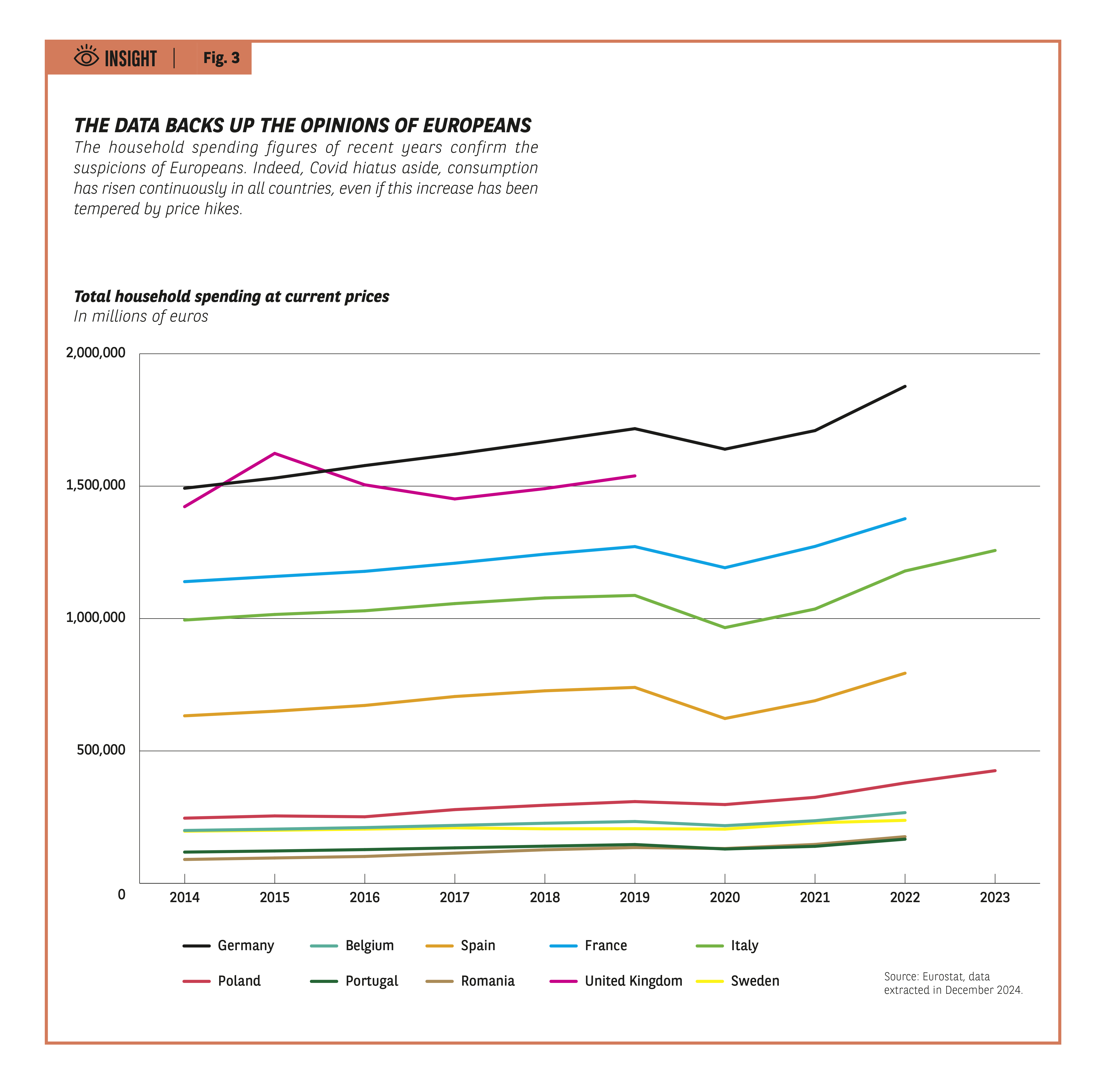 When Europeans are asked to reflect on how their own consumption is changing, their responses are more tentative. Barely 4 out of 10 believe that it has increased over the last decade (Fig. 2). And this time around, the gaps between the countries are much less significant. More than 50% of Portuguese and Romanians feel that this is the case, while the Germans and the French, two populations that we discuss in greater detail in the Barometer, are once again more circumspect, with around 30% of respondents expressing this opinion. And generally speaking, the over-50s and those on the lowest incomes are the most likely to state that their consumption levels have seen little change.