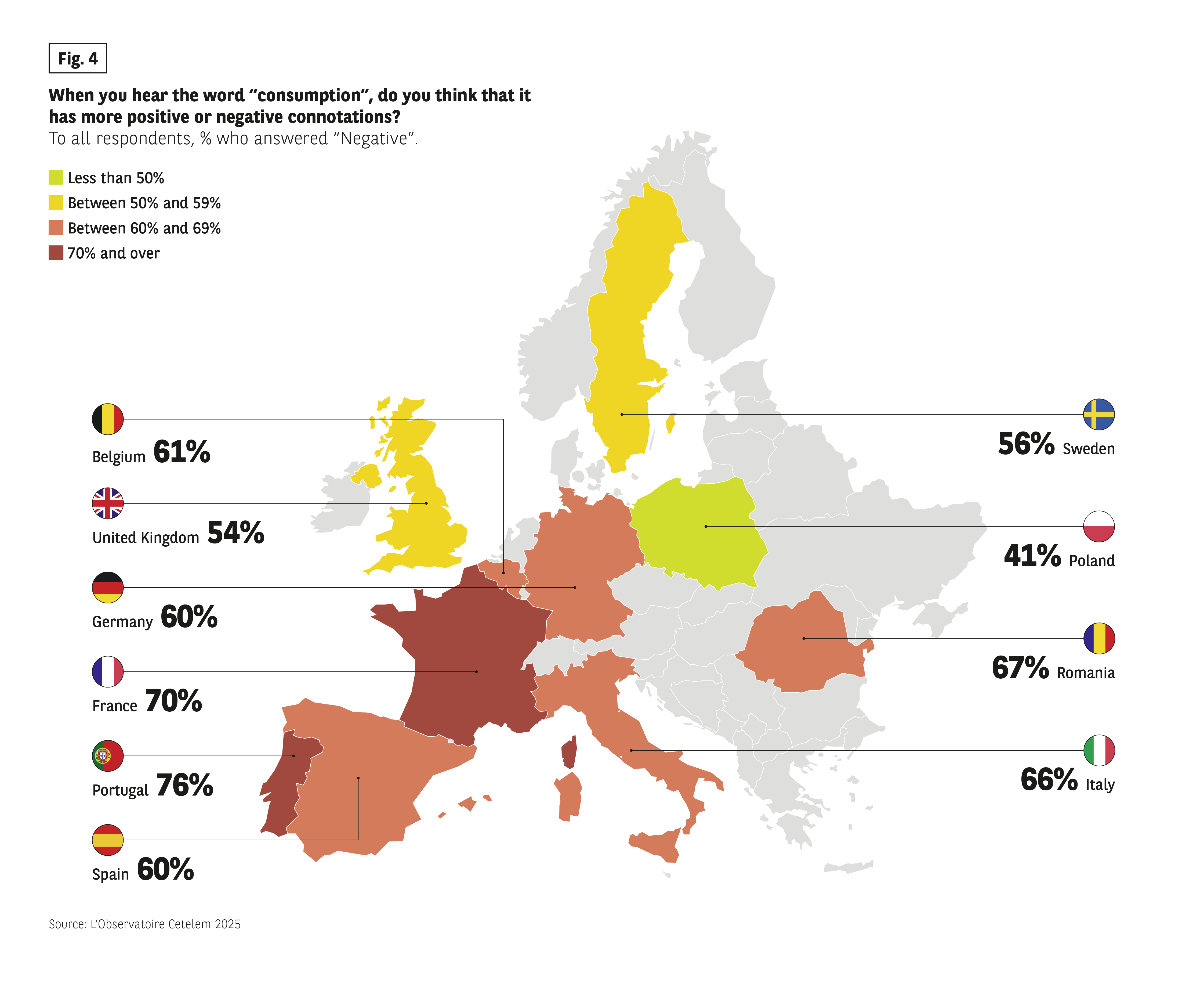 The fact that 6 out of 10 Europeans have a negative image of consumption could be down to the feelings of guilt it might generate (Fig. 4). These sentiments are shared by a majority of people in all countries except for Poland, where only 4 out of 10 experience such guilt. The responses of the Latin countries, including Portugal, France, Romania and Italy, suggest that these perceptions are also cultural in nature and linked to people’s relationship with money and how they spend it. It should also be noted that residents of large towns and cities hold less negative views overall.
