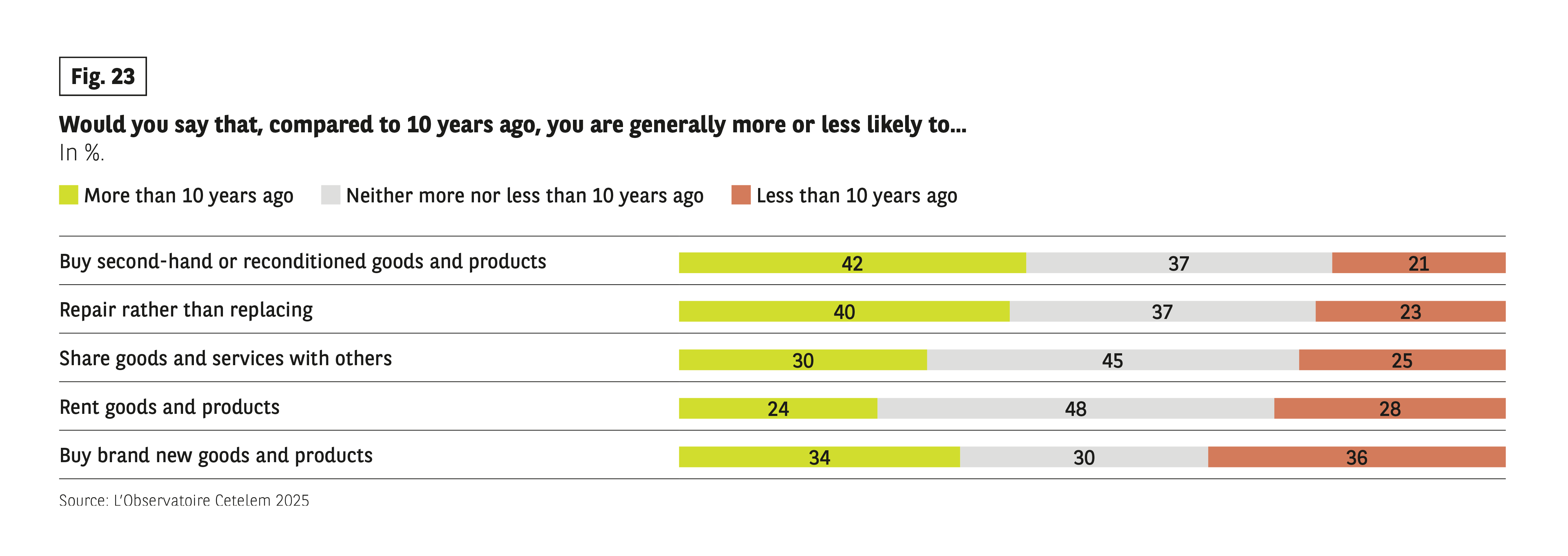 The fact that 4 out of 10 Europeans feel they have been buying more reconditioned or second-hand goods in the last decade provides confirmation of this market’s growth.The Swedes, French, Spanish and, even more so, the Poles are the most accomplished in this area, with the Germans and British at the other end of the scale (Fig. 23).
