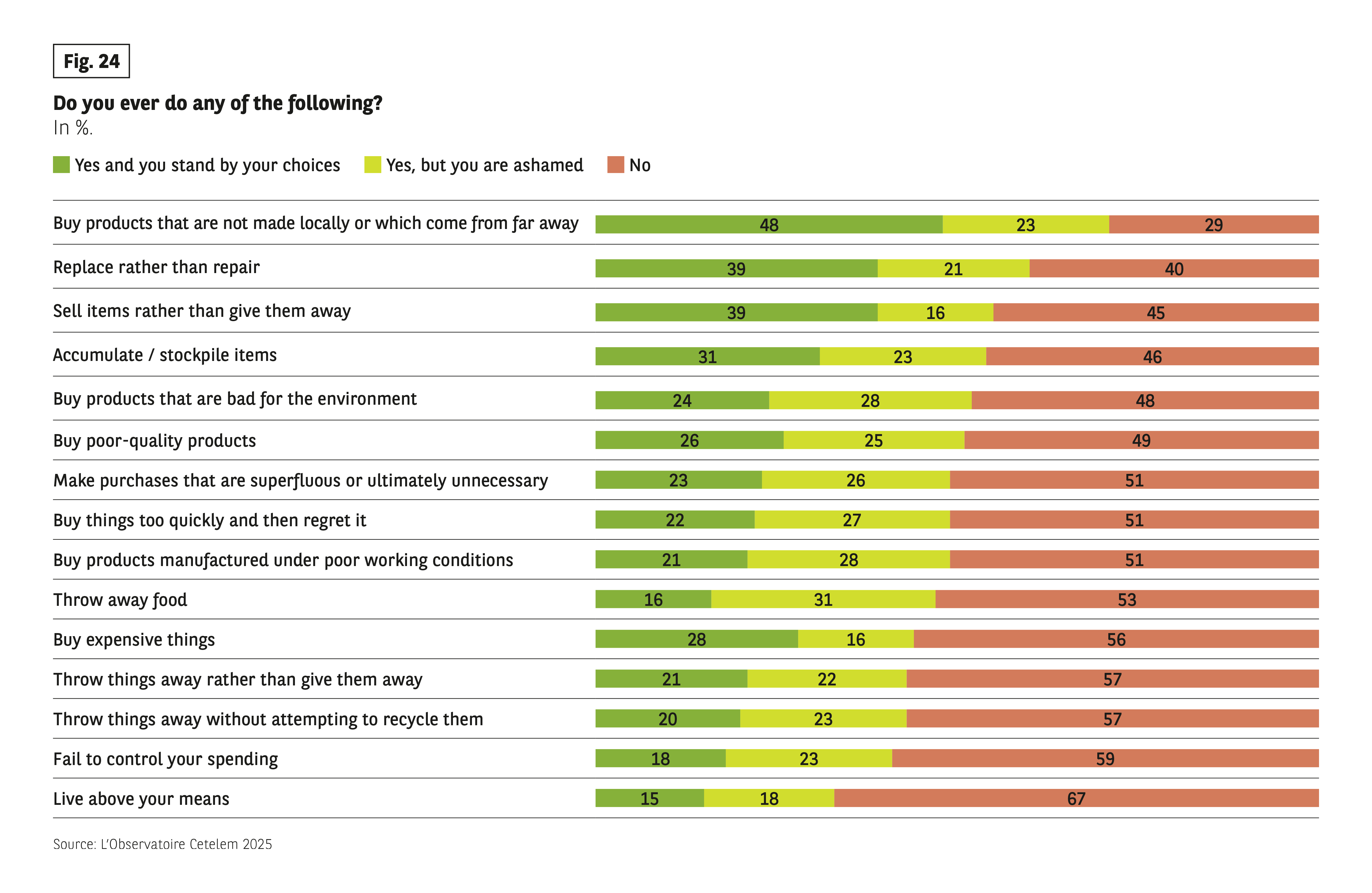 Firstly, half of our respondents say they are not ashamed of buying products that are made far from where they live. Replacing products rather than repairing them and reselling items rather than giving them away elicits no guilt in 4 out of 10 consumers (Fig. 24).