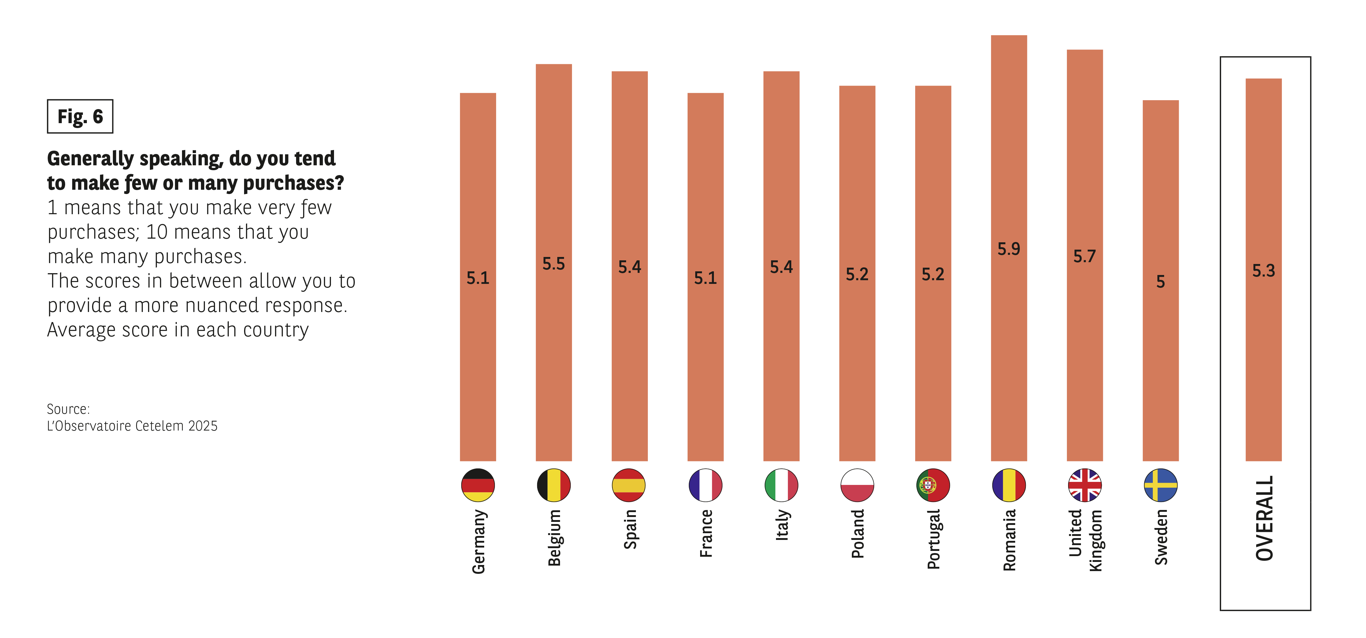 While consumption may be marred with a negative image and described in disparaging terms, Europeans believe they have a degree of control over it. With an average score of 5.3 out of 10, they feel that they consume neither too much nor too little, but just the right amount, like shrewd strategists making carefully considered spending choices. No country scores less than 5 out of 10, with the Romanians and British standing out for their propensity to make more purchases. Age and living environment are two factors that make a significant difference to the results. Younger people and city dwellers consider themselves to be bigger spenders (Fig. 6).