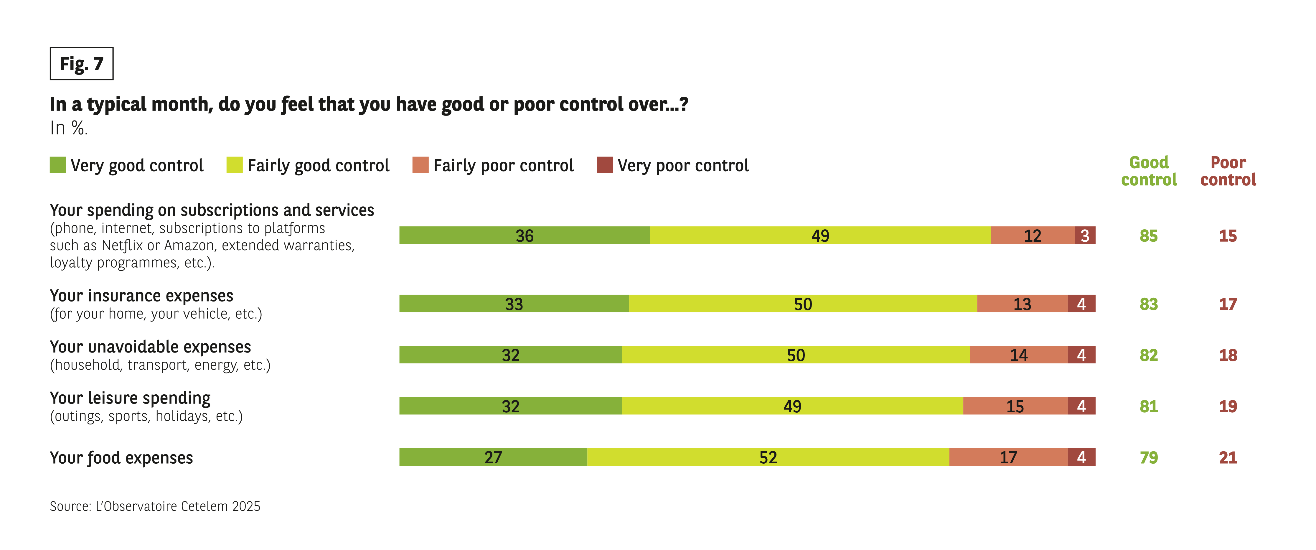 This balanced approach to consumption is matched by people’s very high overall level of satisfaction with their ability to control their expenditure in all areas. Indeed, 8 out of 10 Europeans, and in some cases even more, consider themselves to have good or excellent control over every type of expense put to them (Fig. 7). This is also an area in which the expertise of older individuals wins out over the enthusiasm of the young. Likewise, having a higher income makes it easier to establish such control.