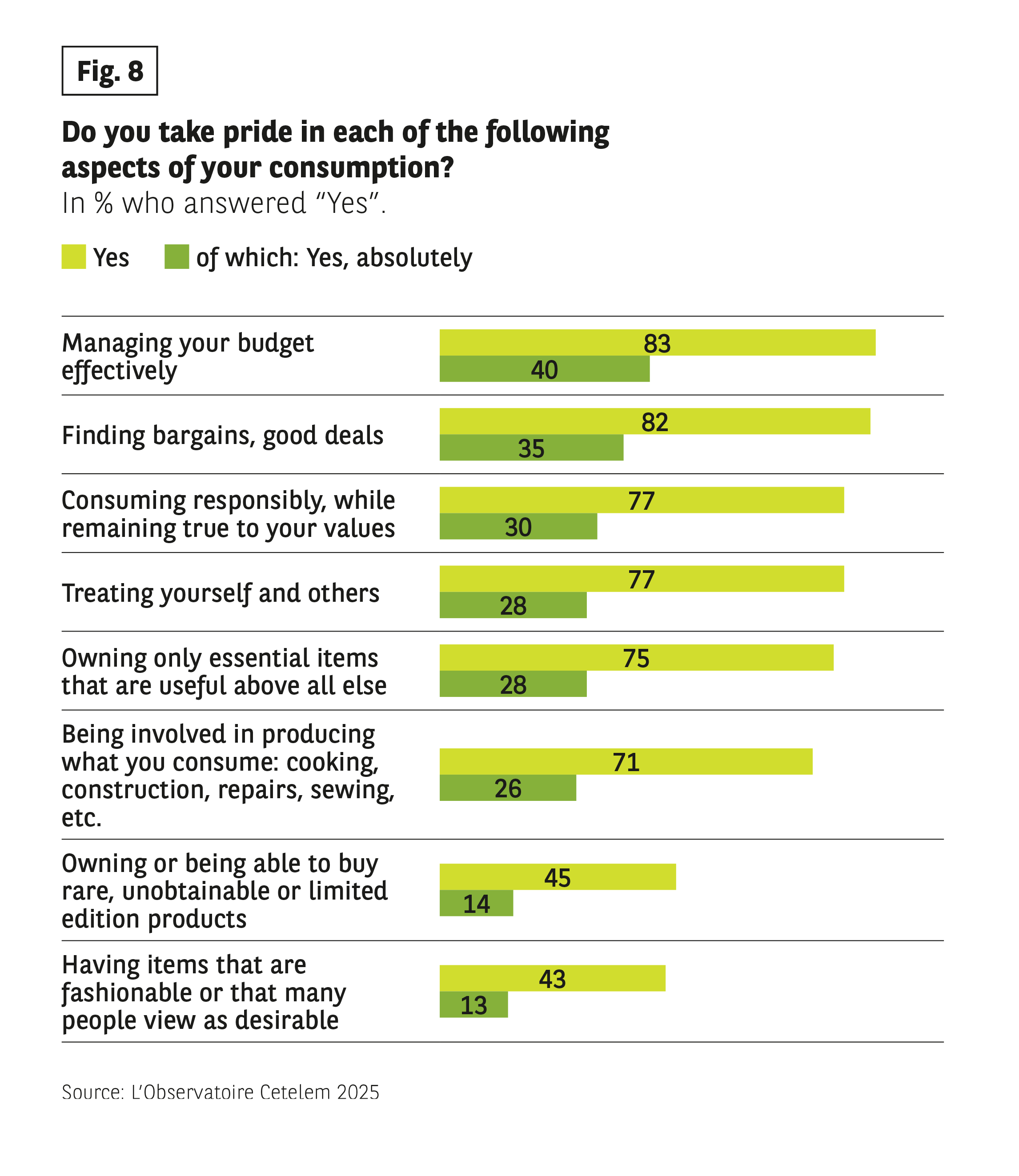 The ability to shrewdly manage one’s consumption budget is widely seen as a source of pride. It is no surprise to find that the feeling of being able to manage one’s budget dominates the ranking (83%), particularly in Italy, Sweden and Portugal (Fig. 8). Older consumers are more likely to take pride in expertly managing their expenses.