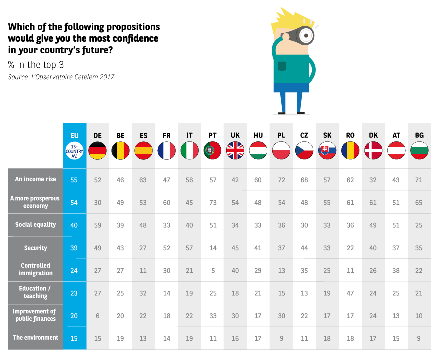 A rise in salaries, a drop in unemployment, economic growth and the reduction of inequality are the four elements that drive confidence (40%, 32%, 29% and 29% respectively). These figures show that Europeans are looking for quick results to prompt a change in direction and an improvement in their country’s situation. Issues such as education and the environment, which are matters for the long term, sit at the bottom of the pile (23% and 15%). Similarly, the reduction of general insecurity, the elimination of the terrorist threat and control over immigration, topics that one might have considered sensitive given recent events, are not viewed as absolute priorities (20%, 23% and 24%). In the eyes of Europeans, confidence needs to be rebuilt in the immediate future, while also being totally quantifiable.