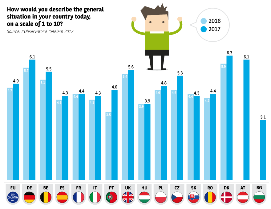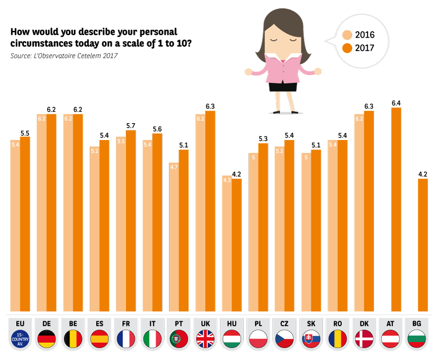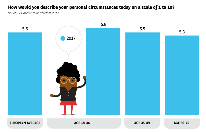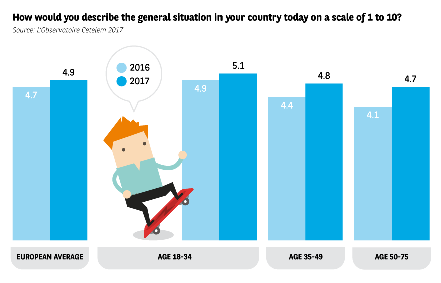 Europeans not only consider the general situation in their country to be improving, they also believe their personal circumstances to be slightly better than in 2016: 5.5/10 compared to 5.4 the previous year. Once again, under 35s are more positive about their personal circumstances, to which they give an average score of 5.8/10.