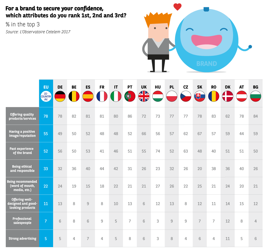 Indeed, 78% of Europeans place the quality of a brand’s products and services in their top three decision-making criteria. In fact, this is the item that comes top in every country covered by the survey. This quality must be reflected in the brand’s identity, which helps to forge its personality.