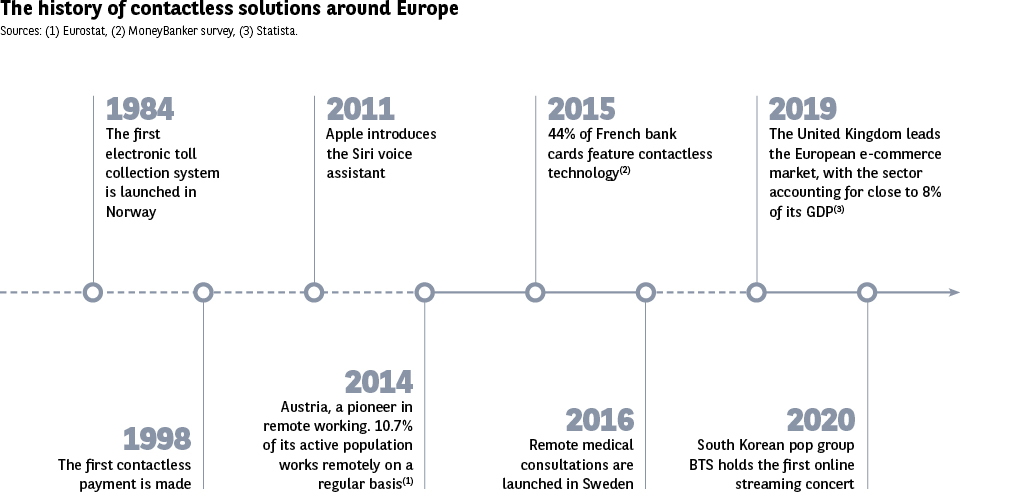 The next two items on the list also highlight the role of the health crisis in heightening awareness of contactless technology. Indeed, virtual communication and remote working are cited in 35% and 33% of cases respectively. As we will discuss later, both of these practices have developed rapidly over recent months. The Austrians even place virtual communication at the top of the list (49%). Meanwhile, the Poles and Bulgarians are most likely to cite remote working (58% and 53%).